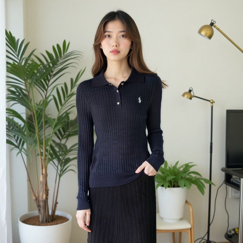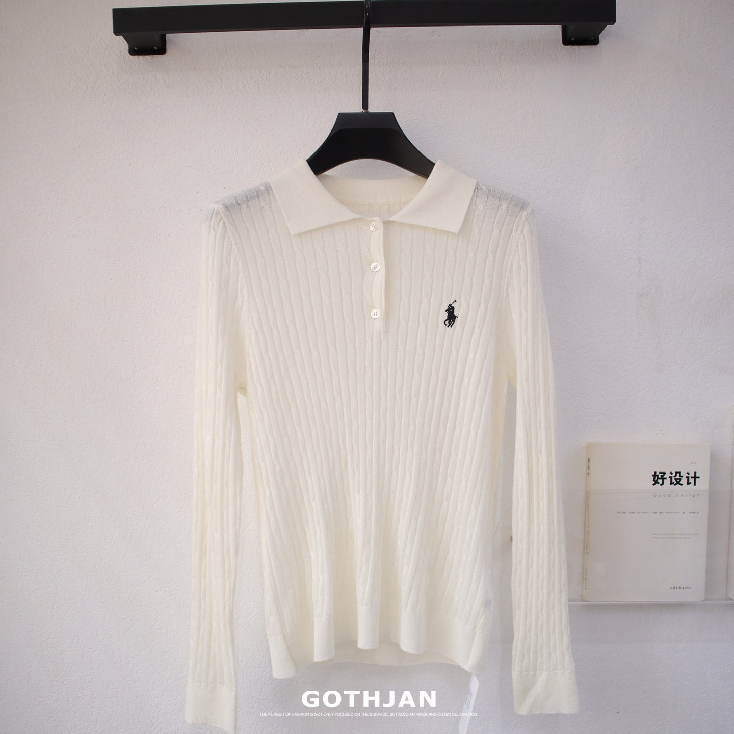 美丽诺羊毛polo领针织衫女2025藏蓝色翻领修身毛衣长袖打底衫上衣