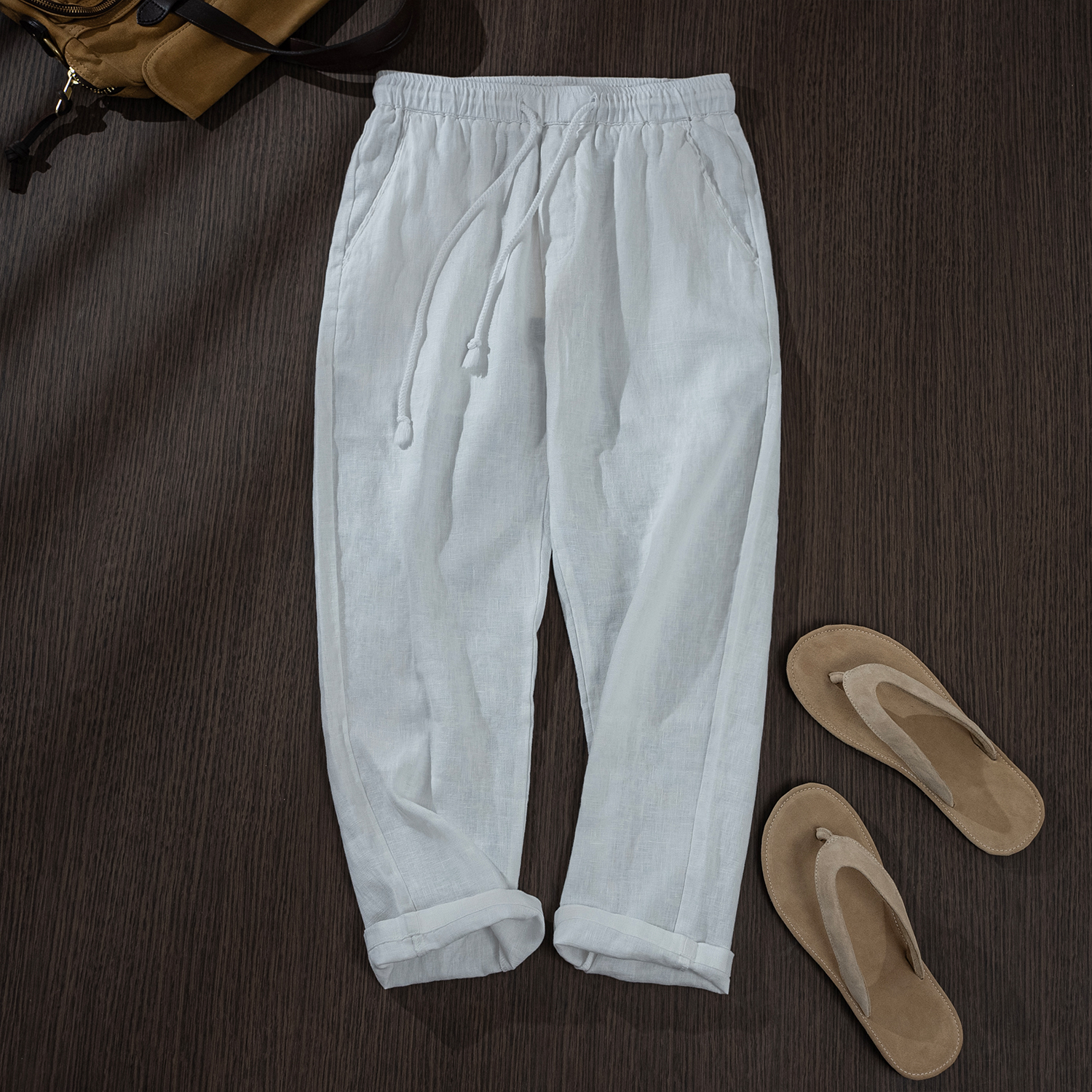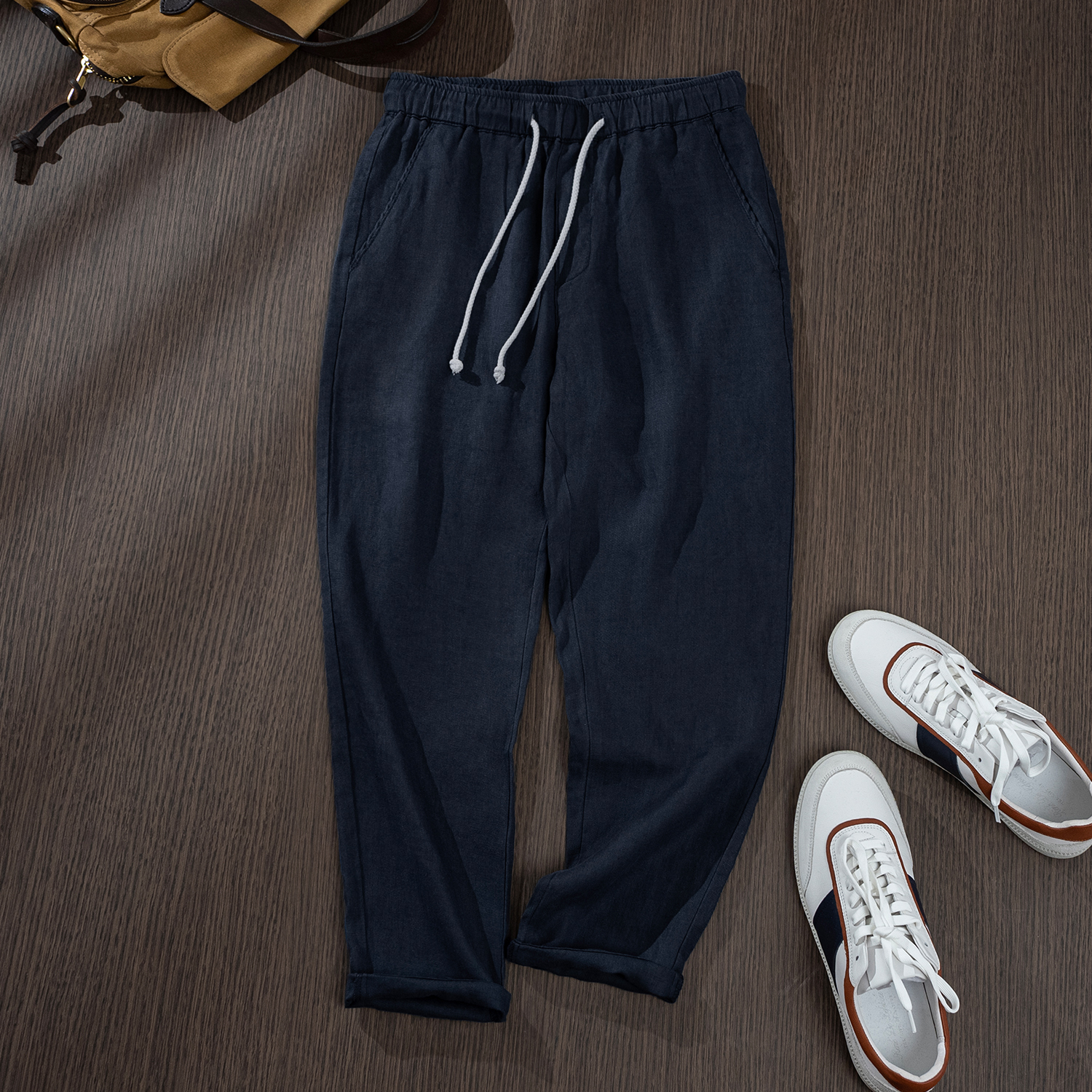 麻尚生活纯亚麻九分男裤夏季新款松紧腰抽绳宽松透气休闲直筒裤子