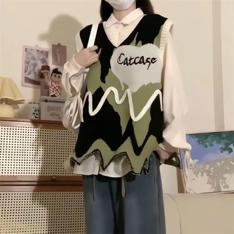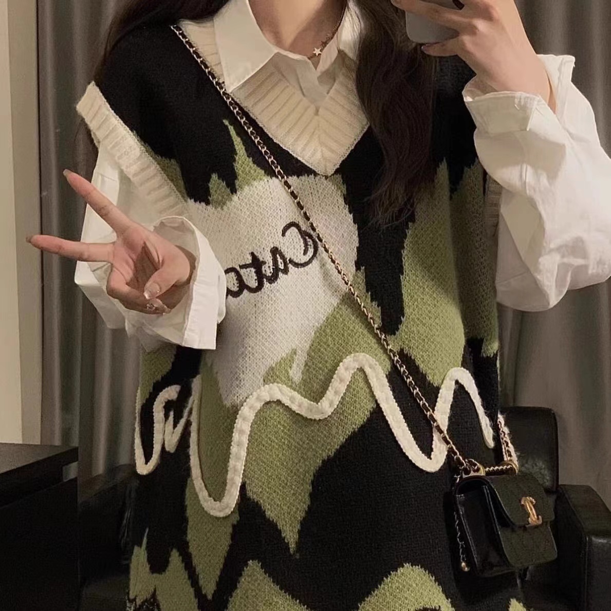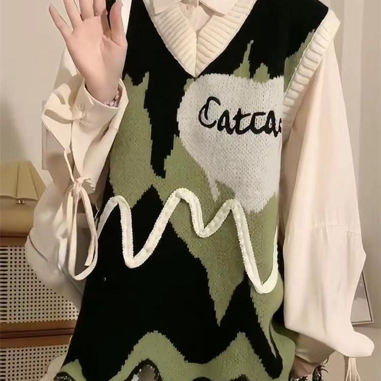 春秋学院风套装女学生韩系不规则V领针织马甲+衬衫+西裤三件套装