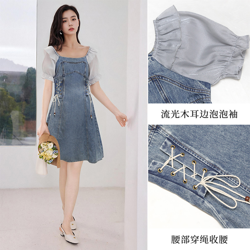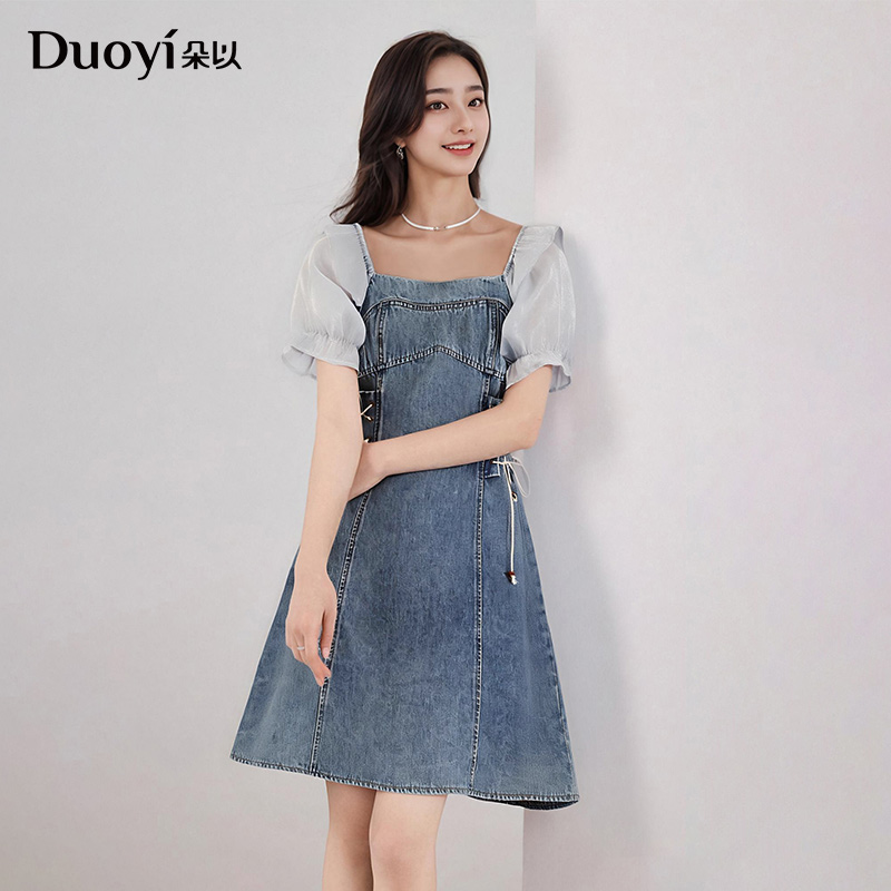 朵以2025夏季新款复古时髦减龄穿绳收腰显瘦方领拼接牛仔连衣裙