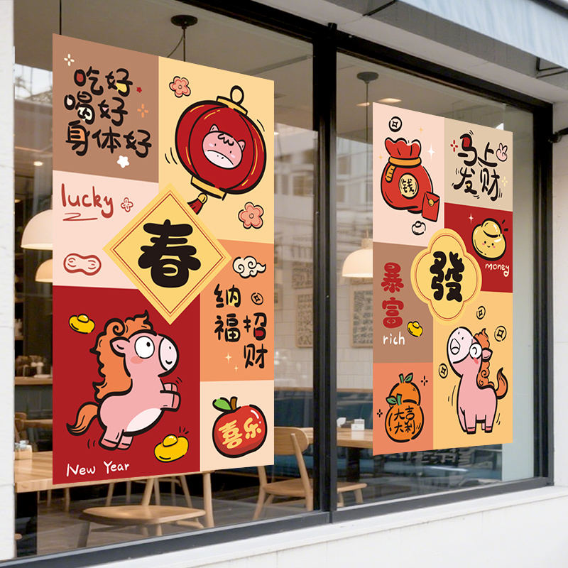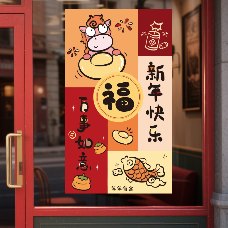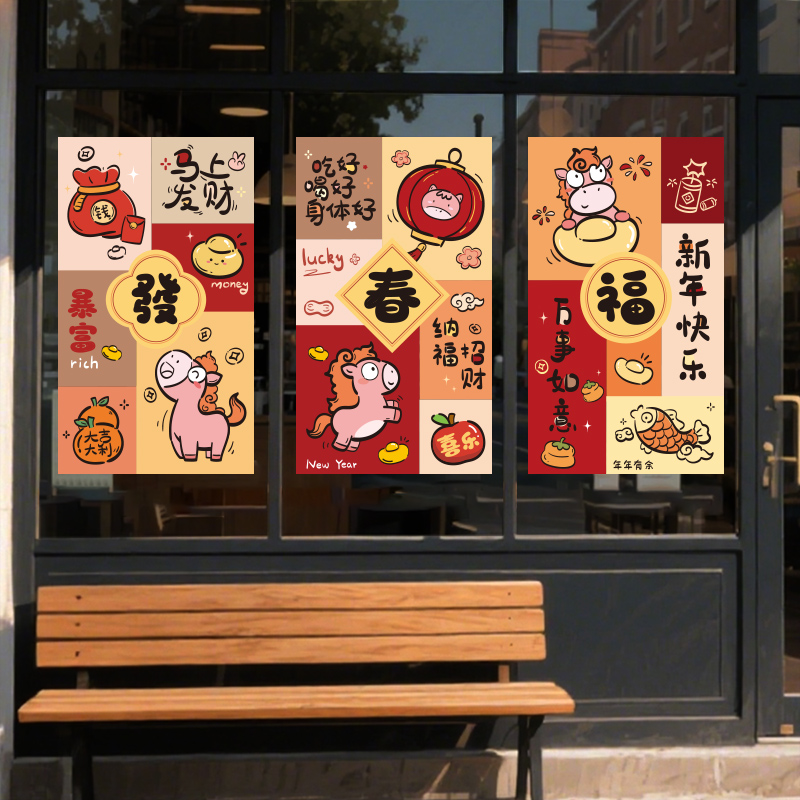 创意元旦新年2026马年福字玻璃贴纸静电窗花贴店铺门贴装饰墙贴画