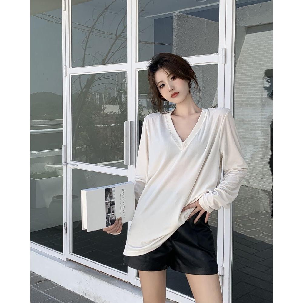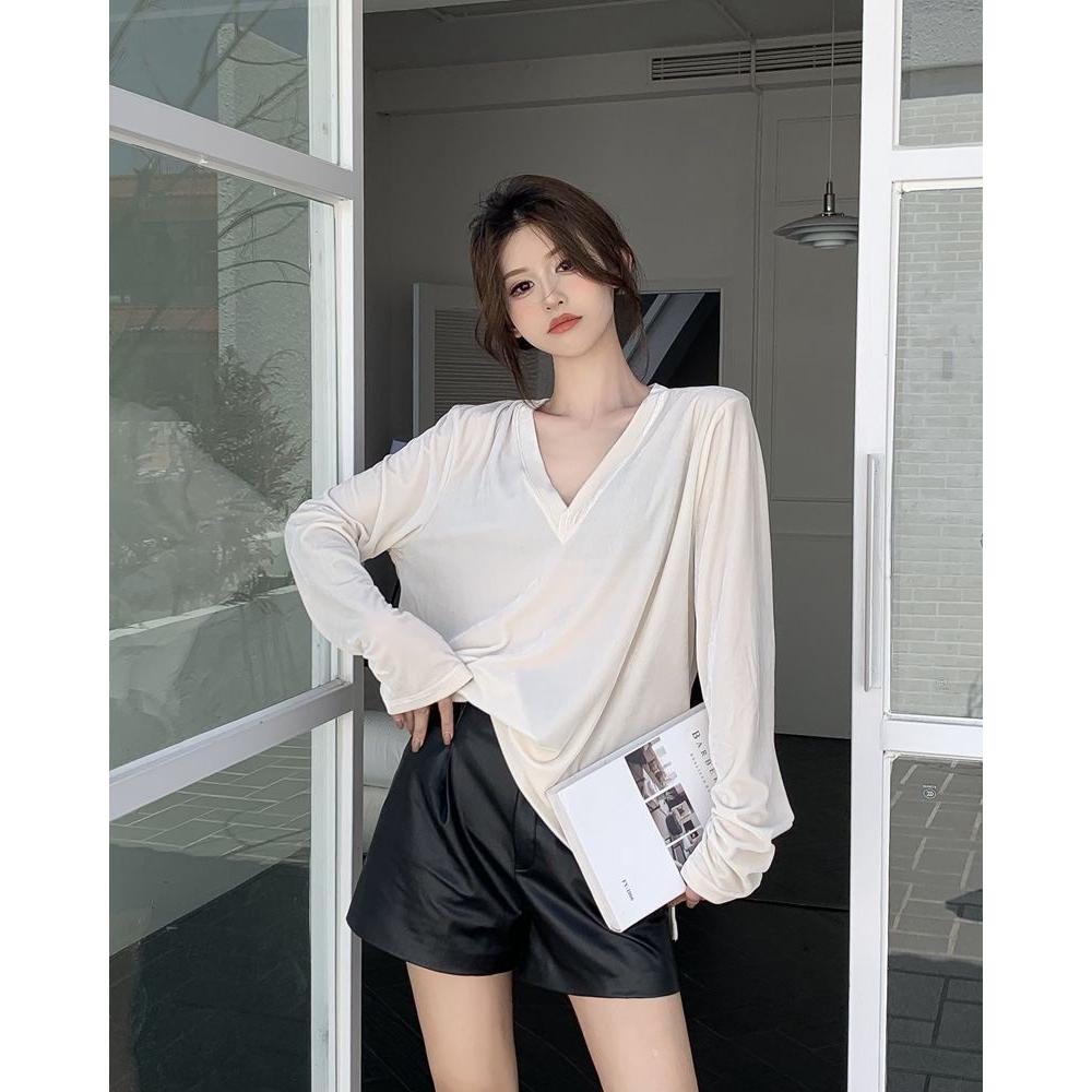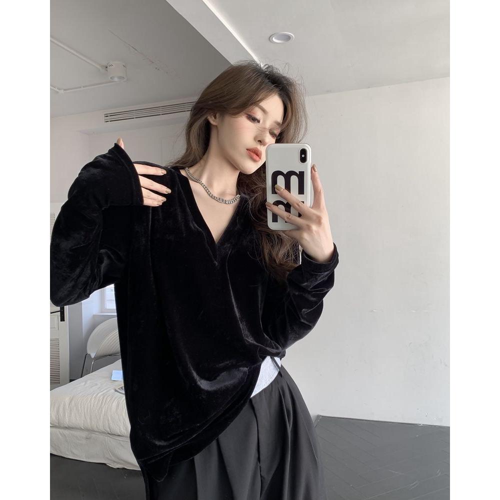 黑色v领长袖丝绒T恤女装秋冬高级感气质宽松中长款内搭打底衫上衣