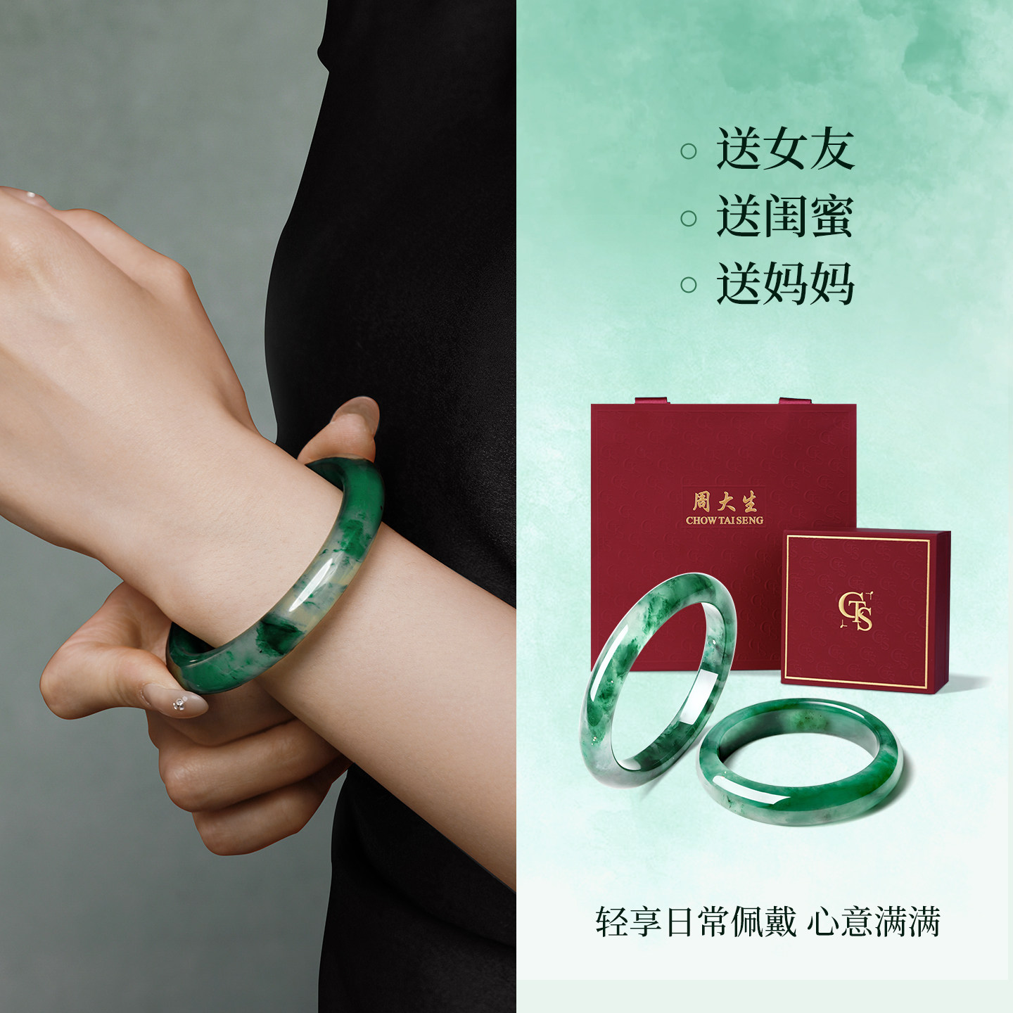 周大生天然正品飘花非洲翠玉手镯子玉镯女款情人节礼物女生送妈妈
