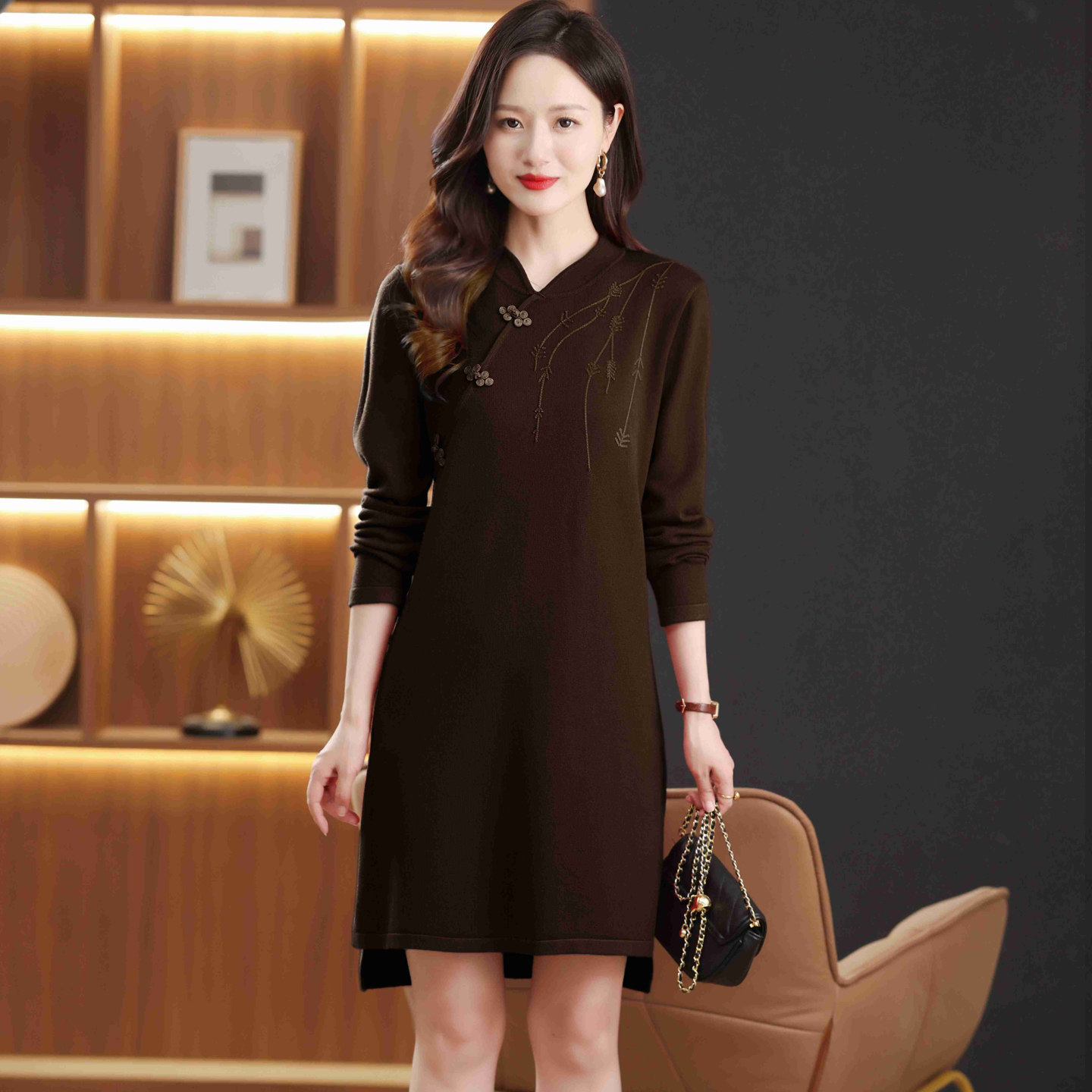 2025年秋冬新款高级感针织连衣裙新中式国风盘扣刺绣中长款打底裙