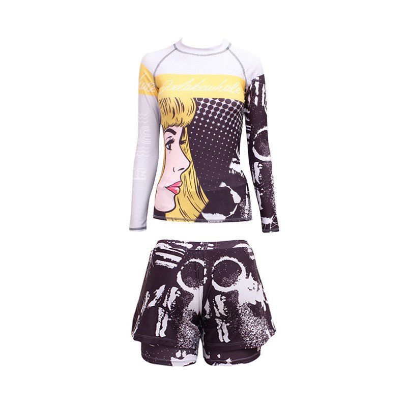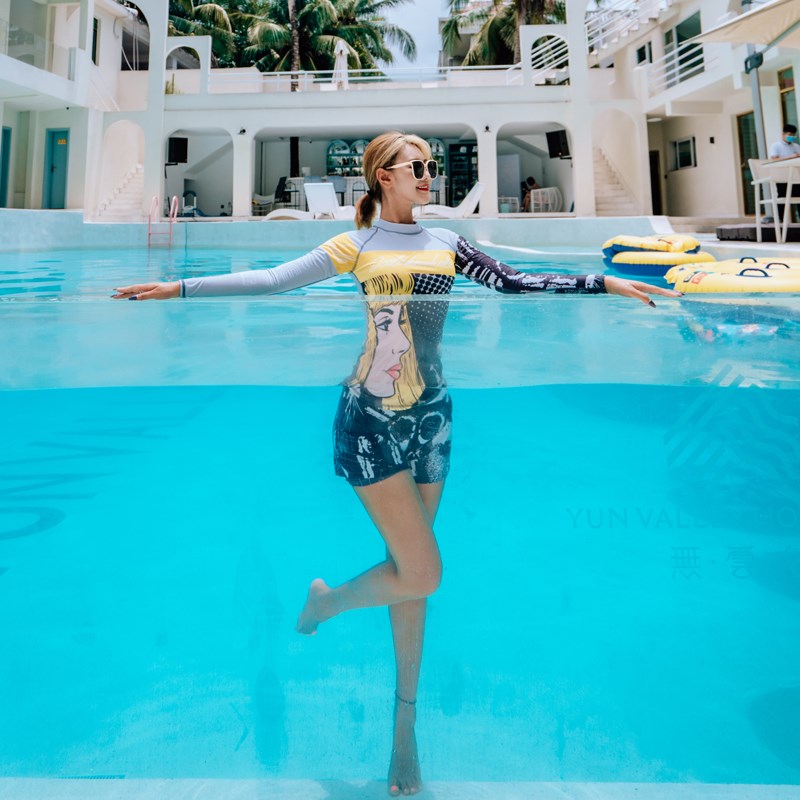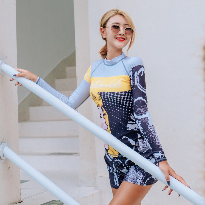 女士分体平角泳衣长袖防晒圆领套头带胸垫两件套潜水服速干泳装