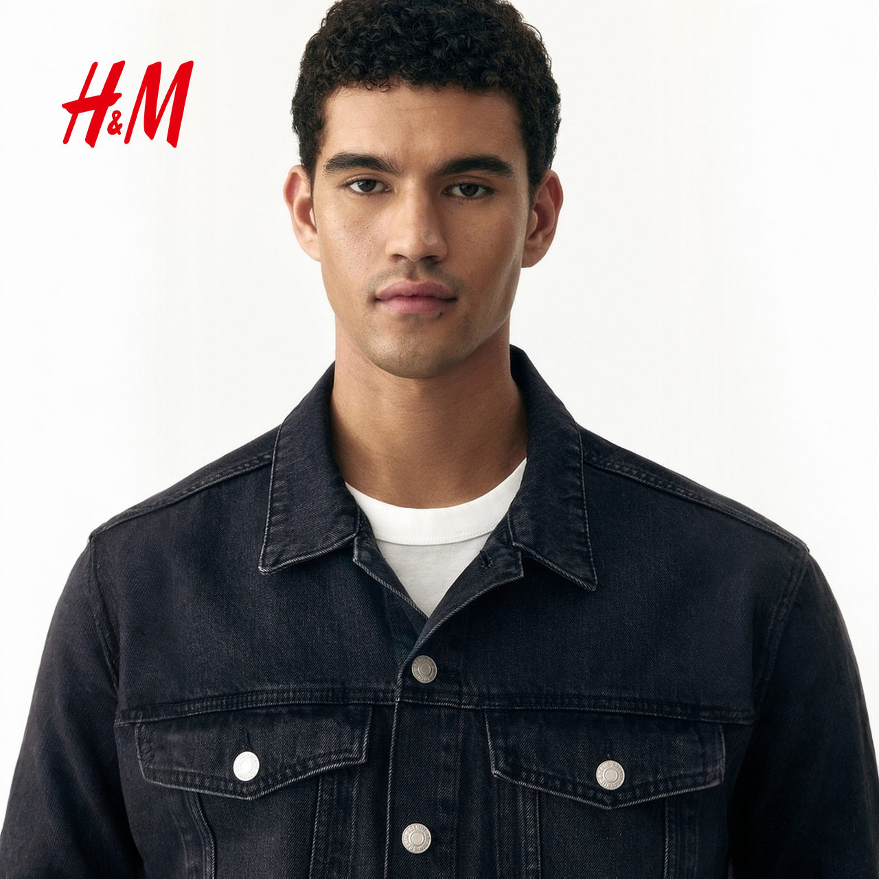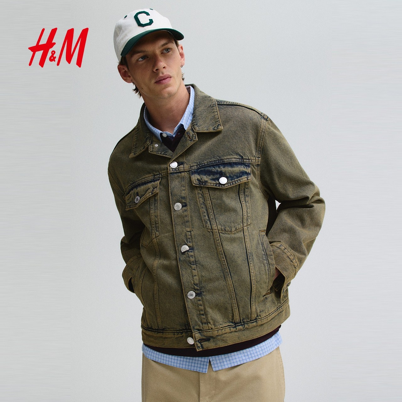 HM男装牛仔外套春季翻领宽松情侣美式单排扣夹克1295737