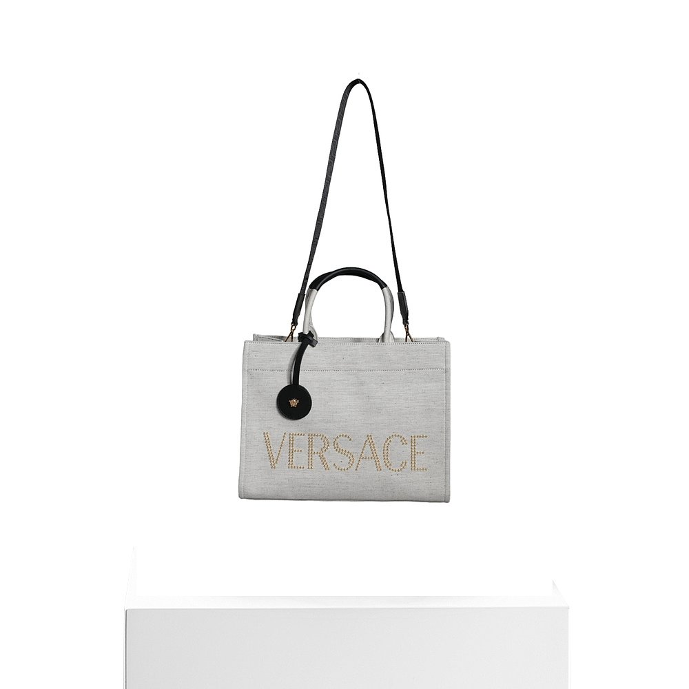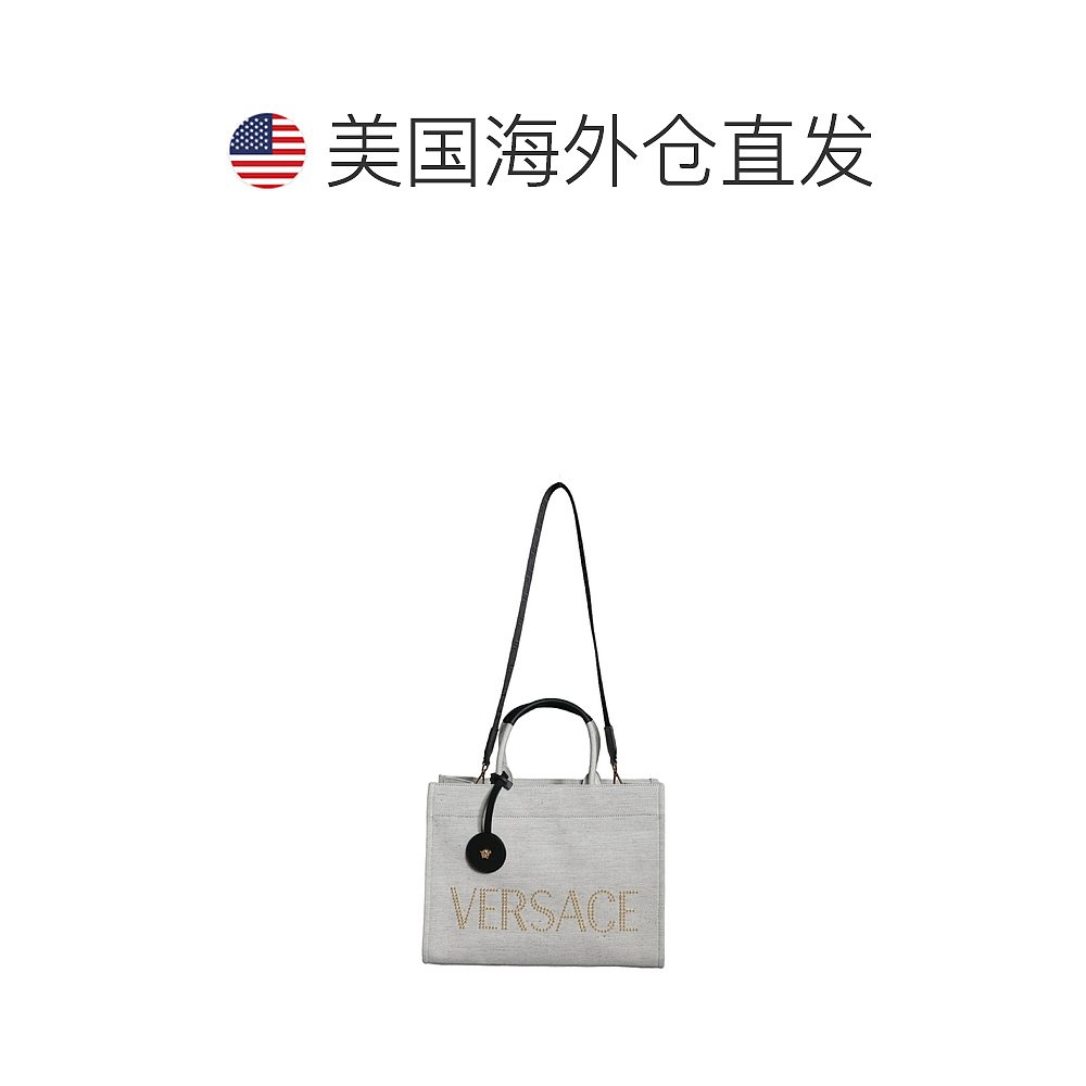 自营Versace 顶部手柄帆布皮革徽标斜挎包女士包 - 黑色/白色 美