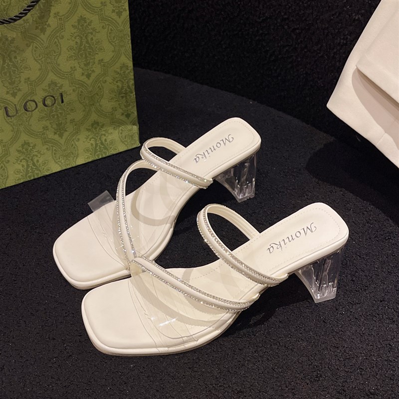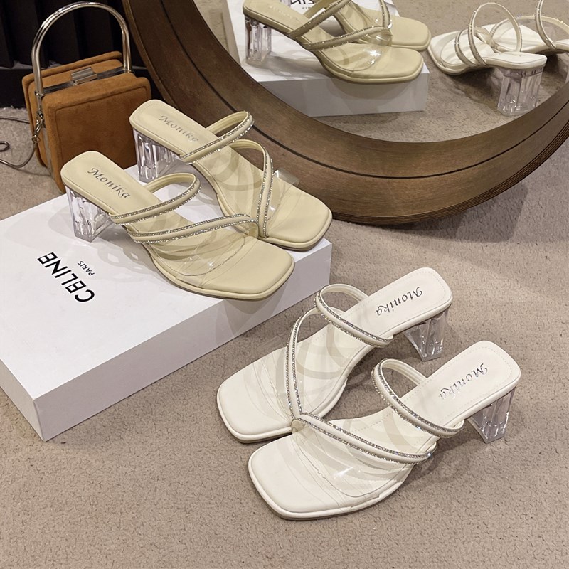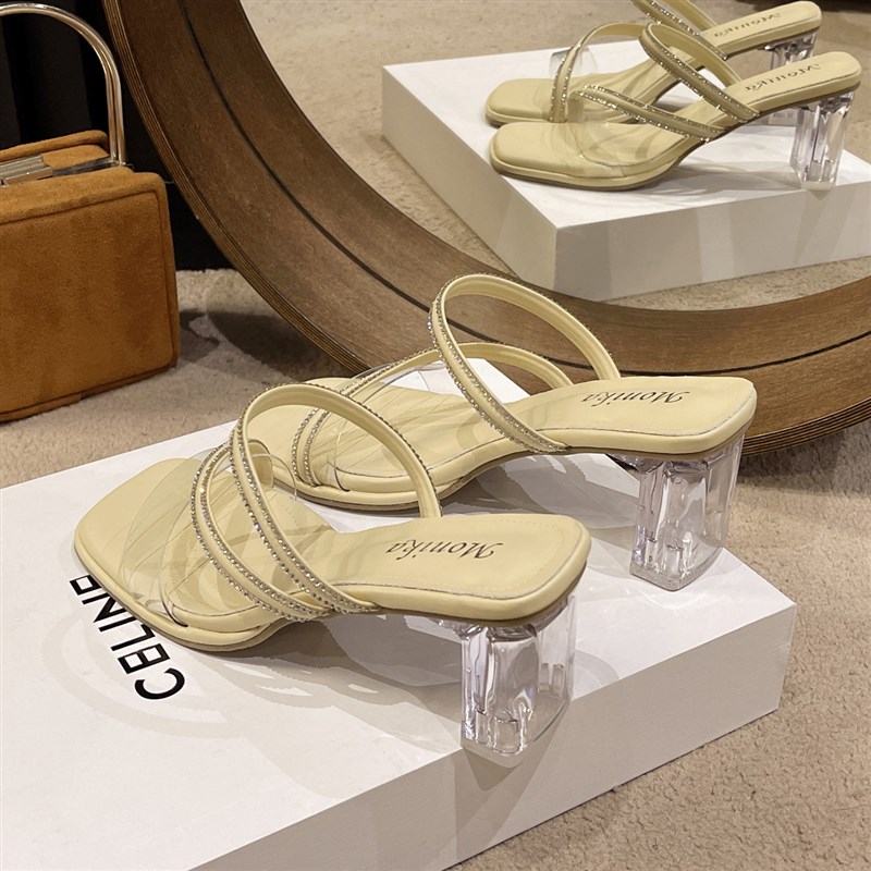 凉拖鞋女2025夏季新款时尚透明水晶跟粗跟露趾一字凉拖高级小香风
