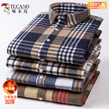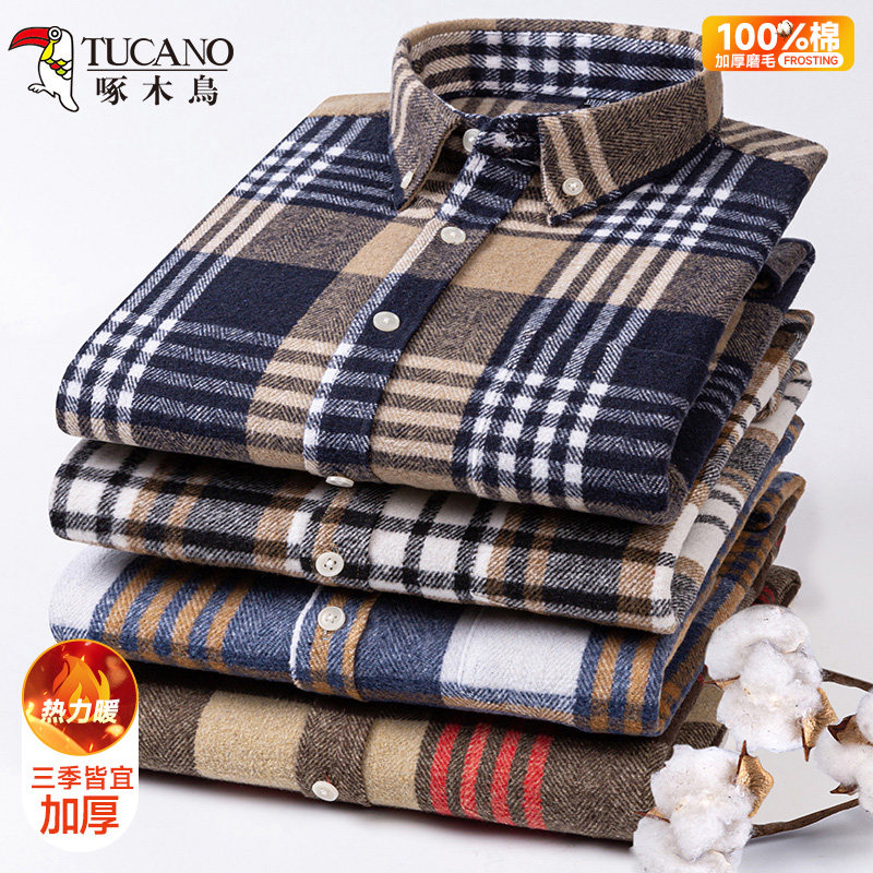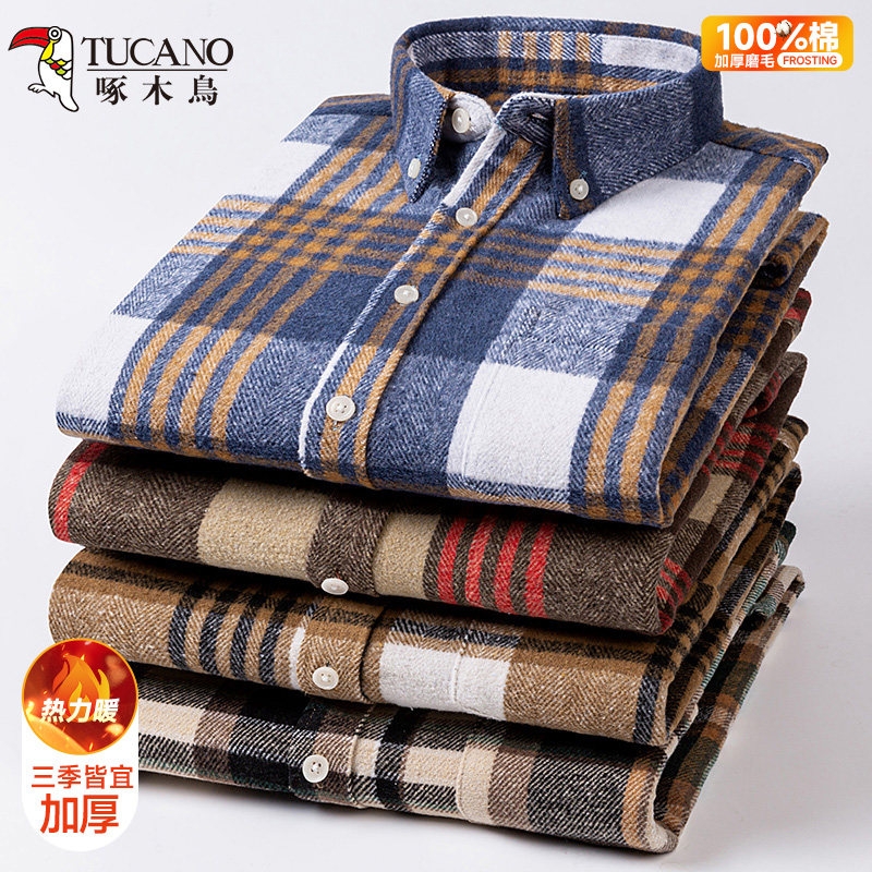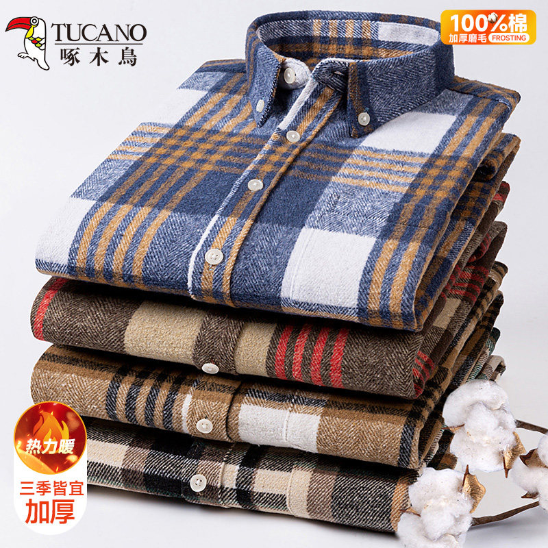 TUCANO啄木鸟100%棉加厚磨毛格子衬衫男长袖保暖衬衣休闲衬衫