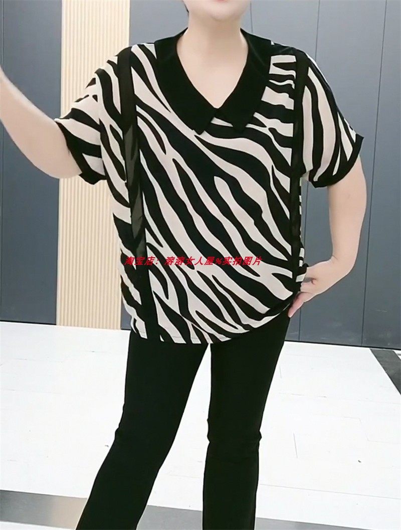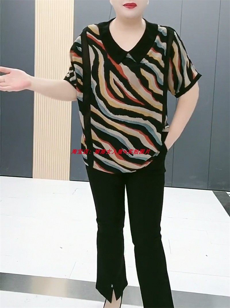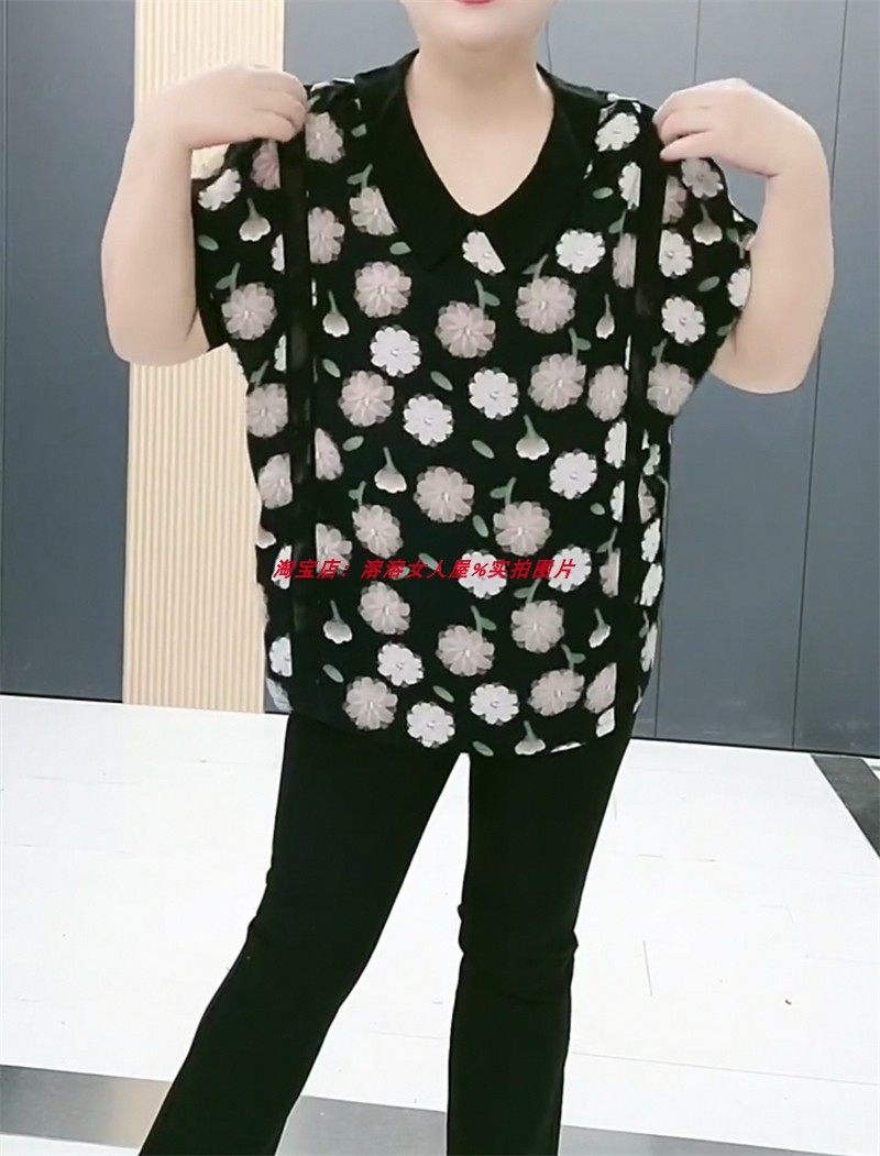 加大上衣娃娃领碎花短袖雪纺衫