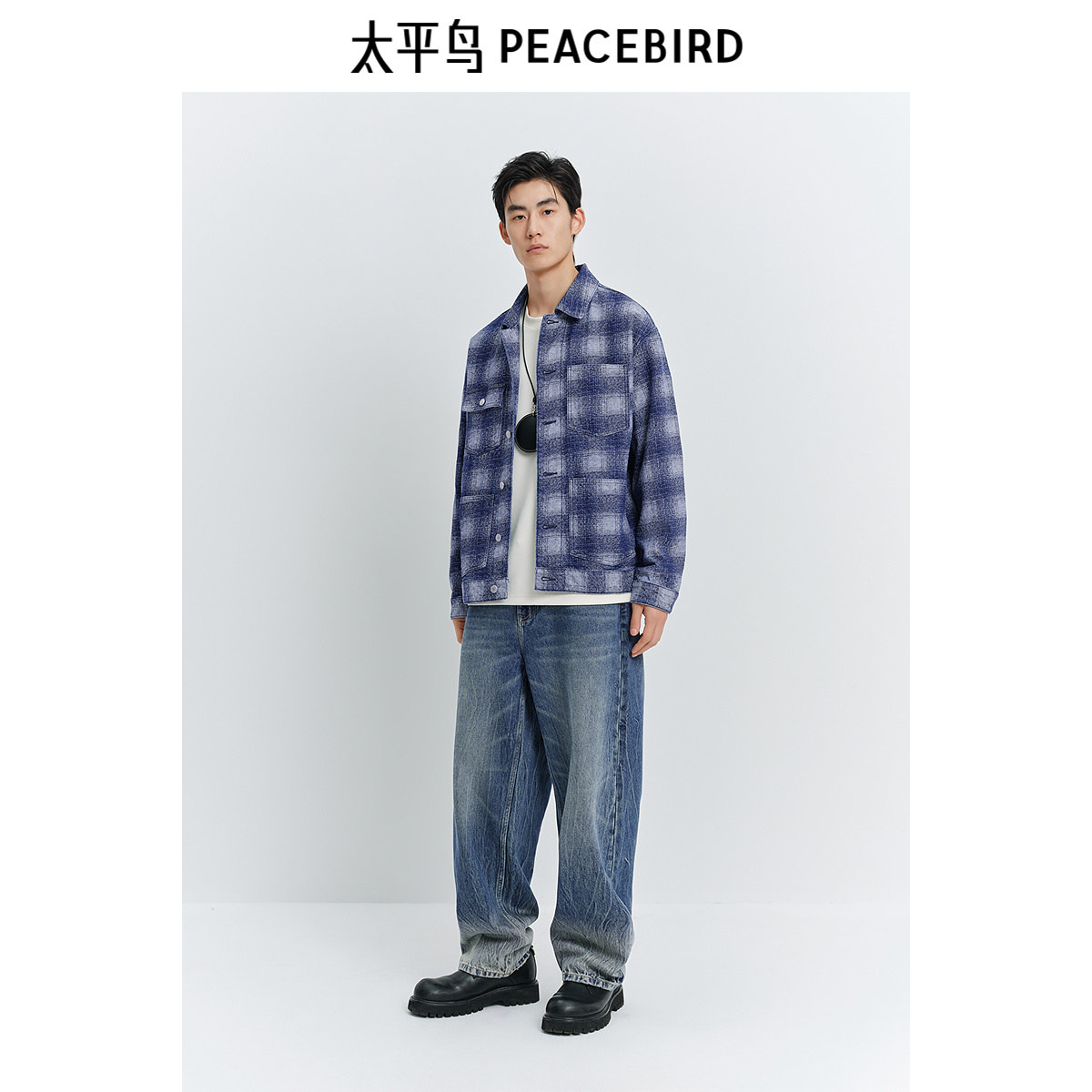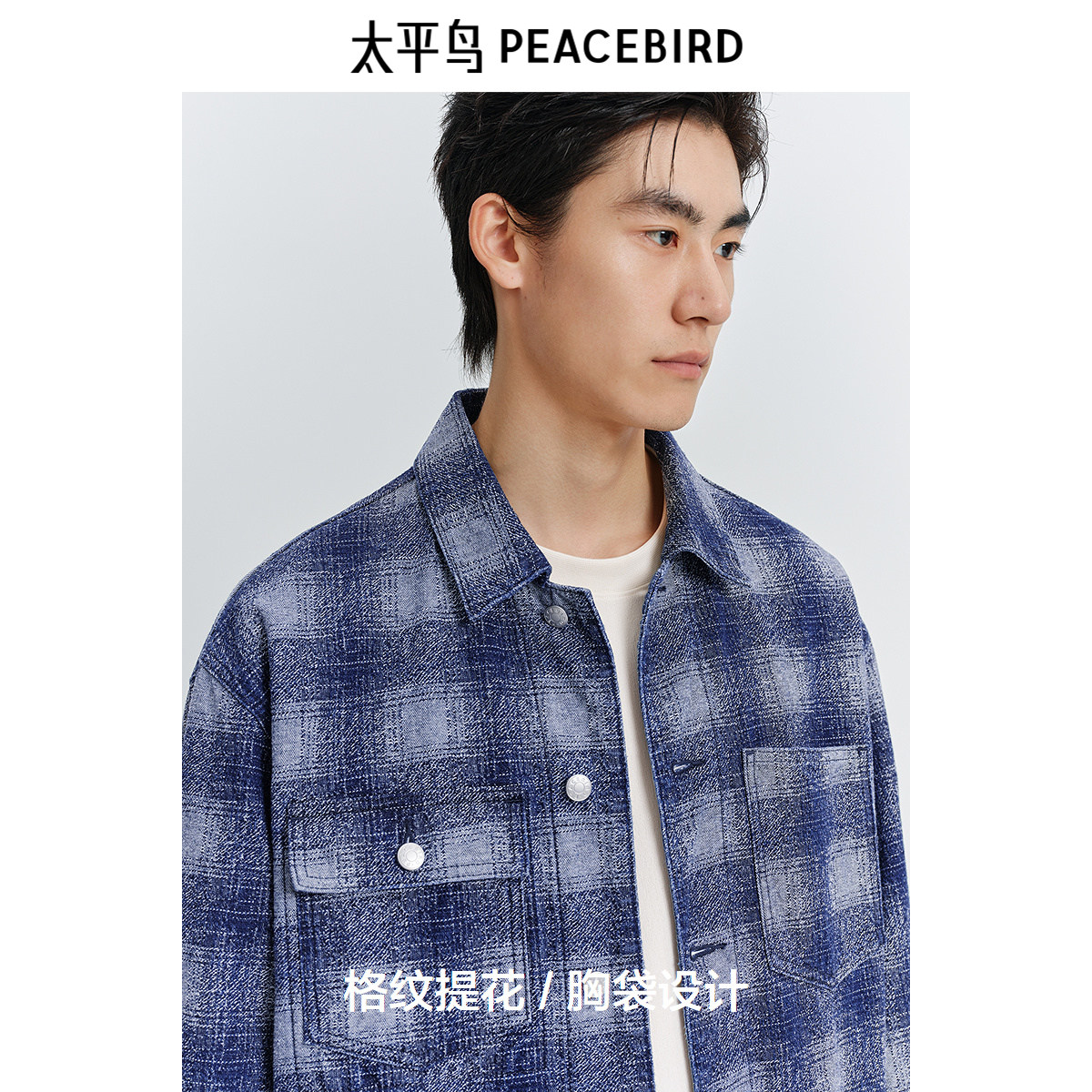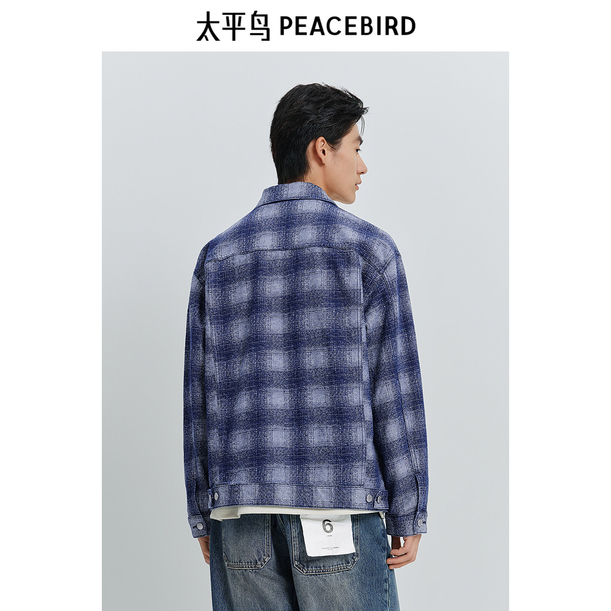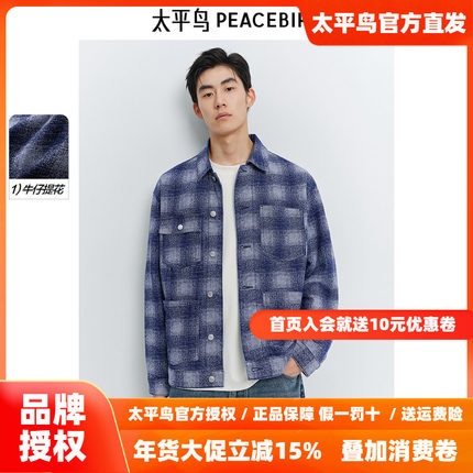 太平鸟男装复古蓝色格纹牛仔夹克25春新款宽松工装休闲茄克外套