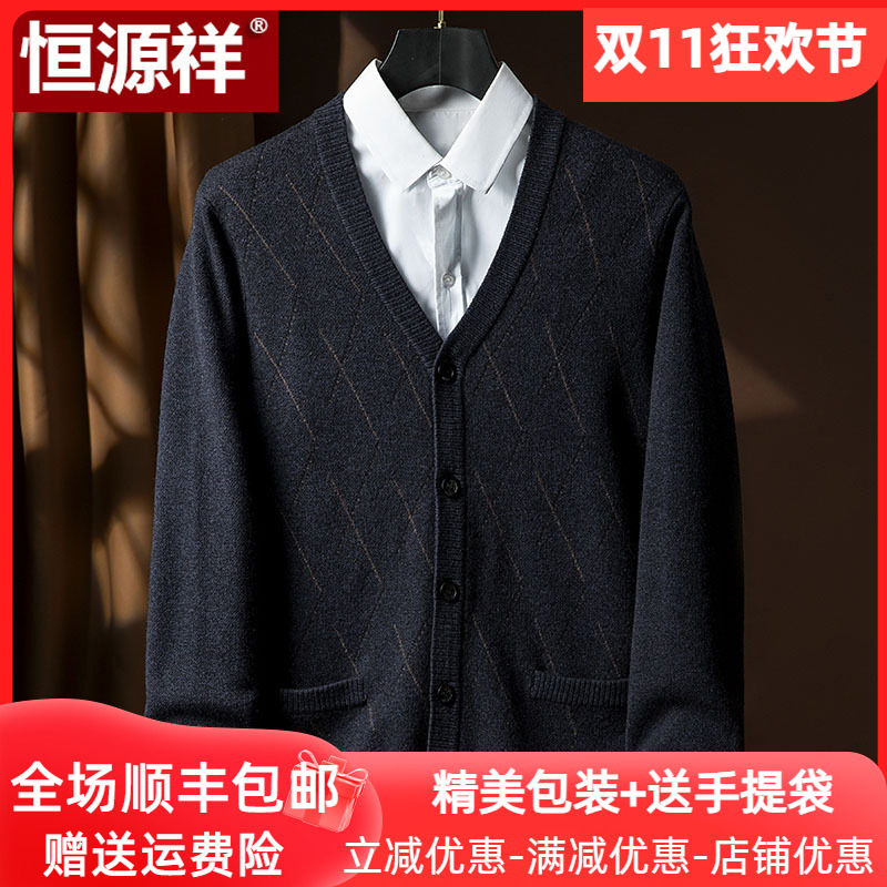 恒源祥爸爸本命年红色毛衣中老年加厚外套男士纯羊绒针织V领开衫