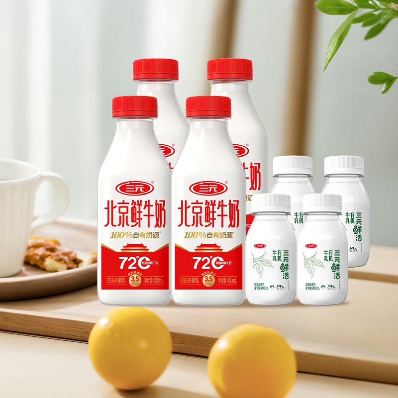 三元72度北京鲜牛奶450ml*4+鲜活有机200ml*4早餐奶冷藏低温牛奶