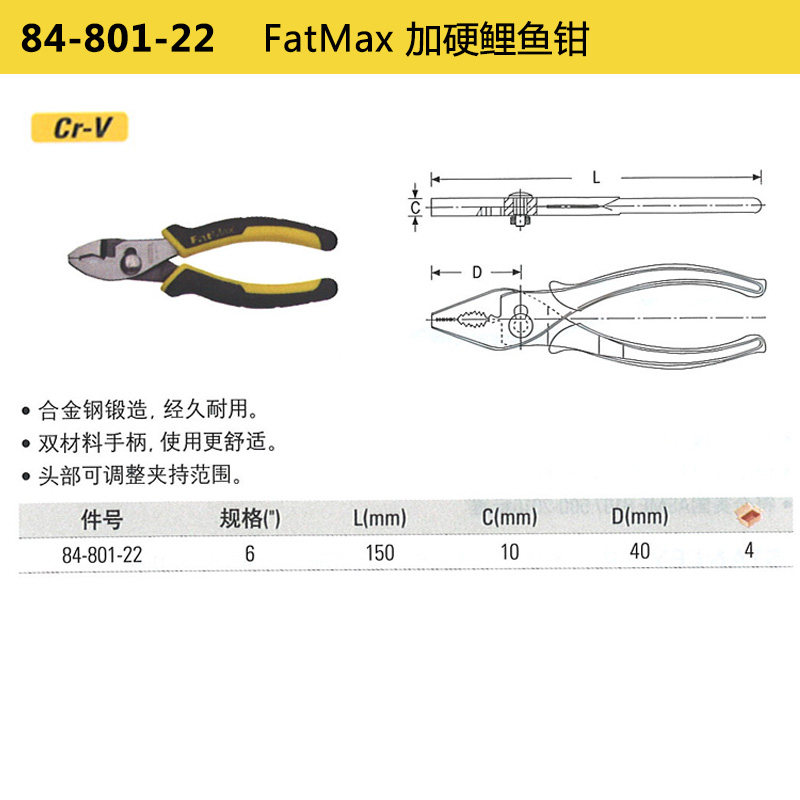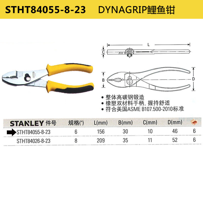 史丹利工具橡塑柄鲤鱼钳6寸8寸多功能汽修夹钳加硬鱼嘴钳子鱼尾钳