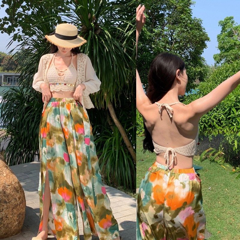 阔腿裤女夏季薄新款碎花高腰宽松垂感显瘦泰国直筒长裙裤两件套装
