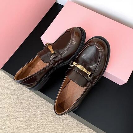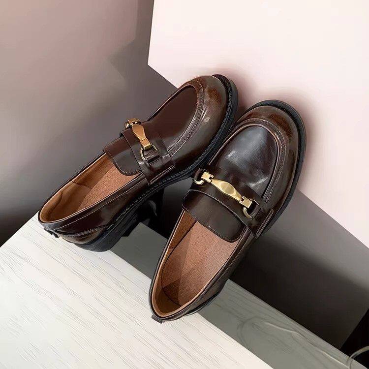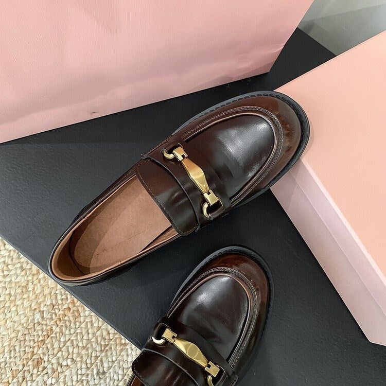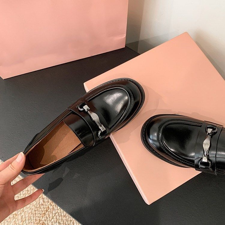 复古乐福鞋女2026春季欧货新款粗跟圆头金属扣英伦风一脚蹬小皮鞋