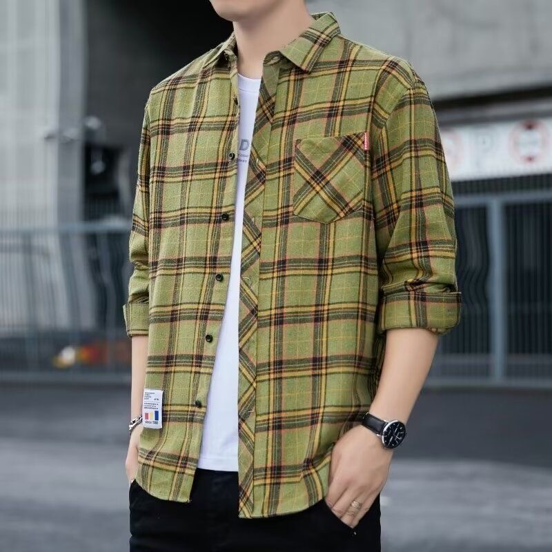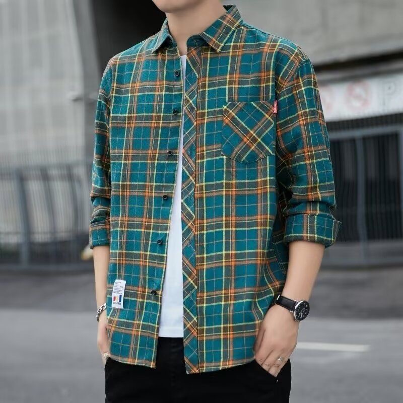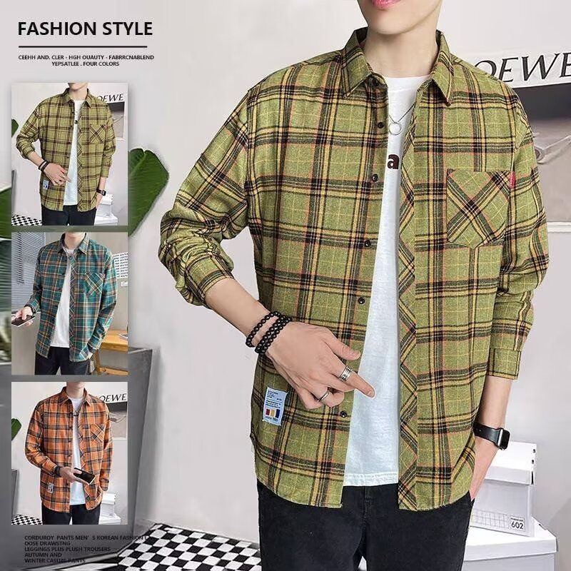 格子长袖衬衫男春秋宽松韩版潮学生休闲复古外穿磨毛纯棉衬衣外套