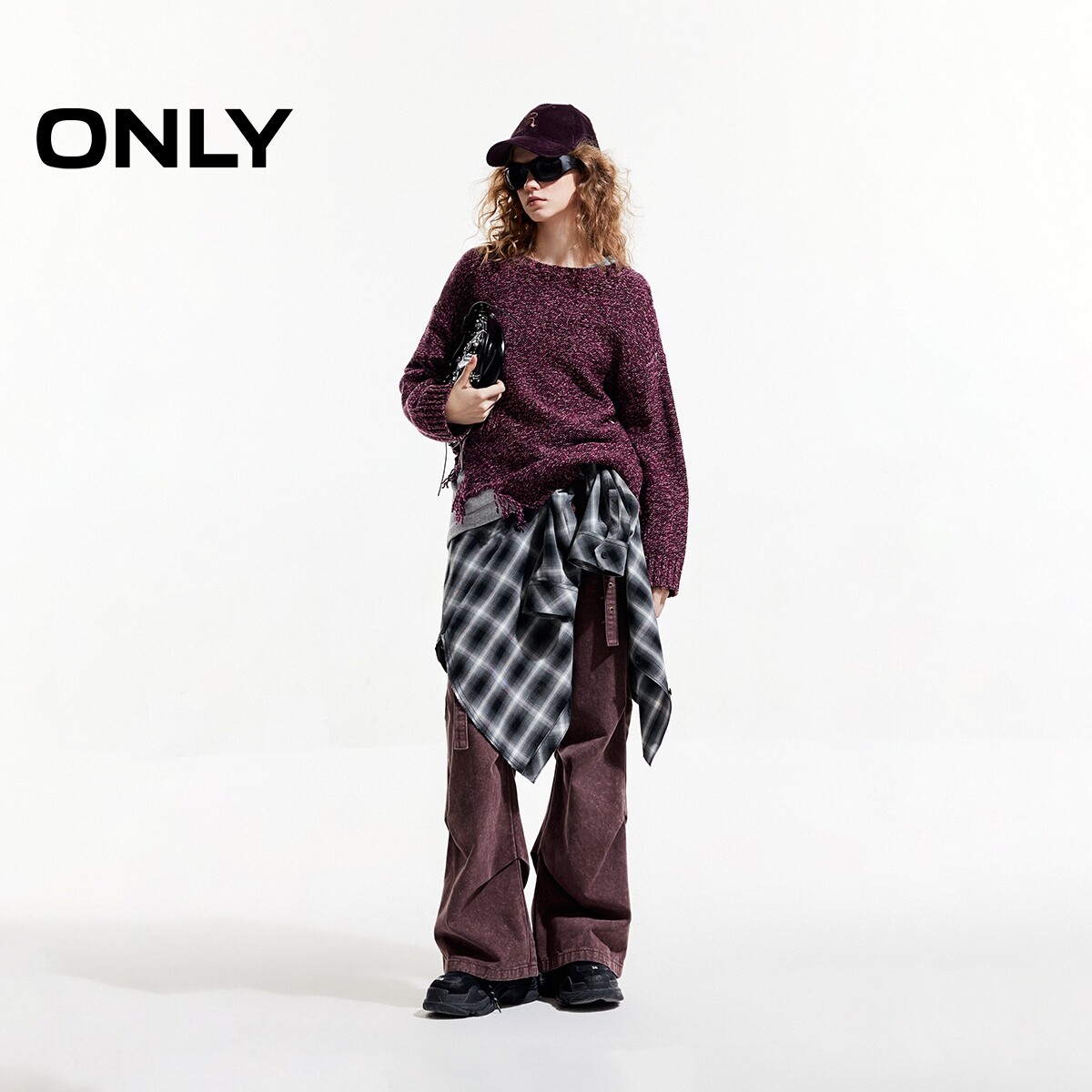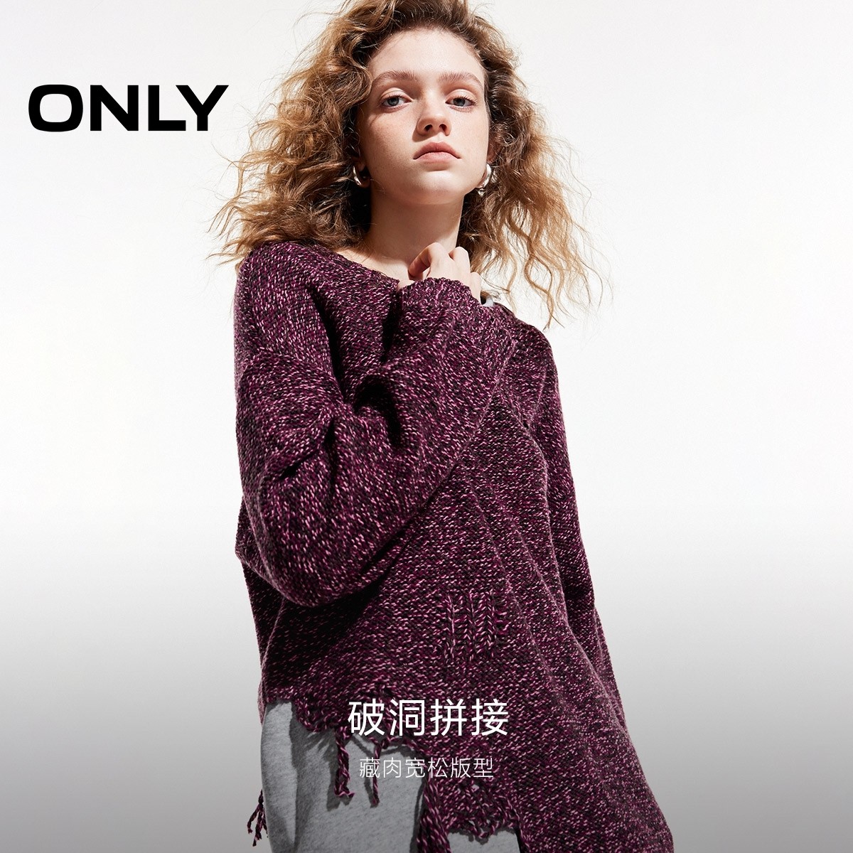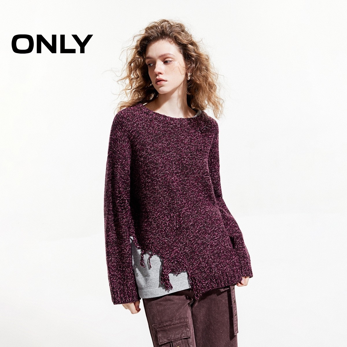 ONLY2025秋季新款时尚个性破洞慵懒宽松落肩拼接毛衣针织衫女