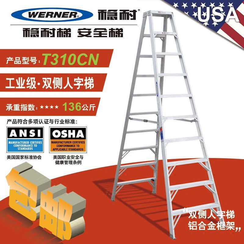 稳耐商业级人字安全梯加厚铝合金工y业两用双侧人字梯 T310/DP360