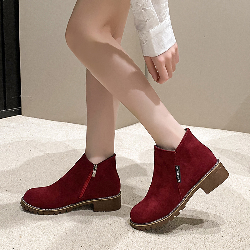 短靴女粗跟圆头侧拉链韩版及踝靴秋冬季百搭防滑中跟靴子大码女靴