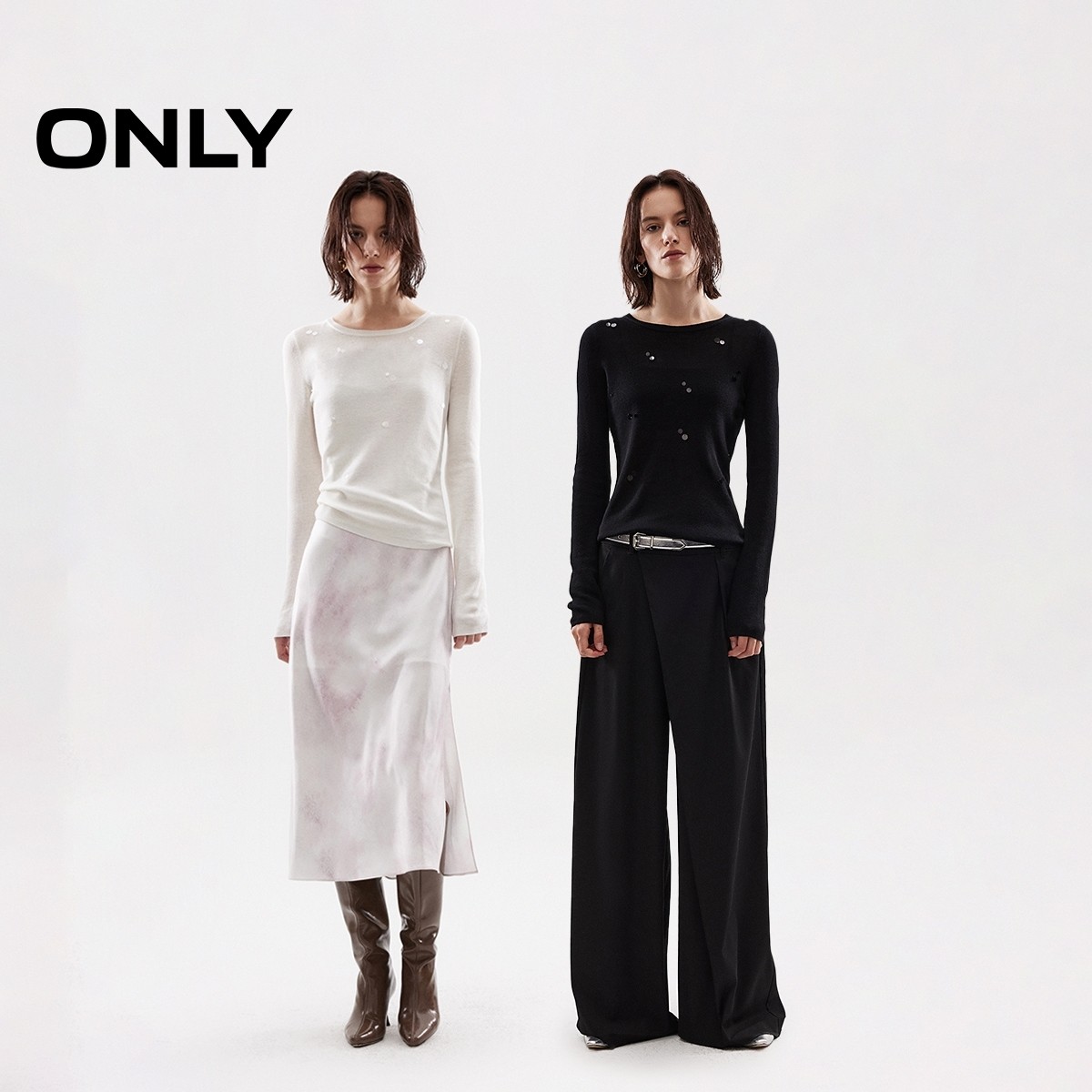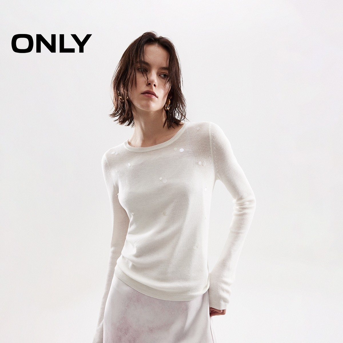 ONLY2025冬季新款亲肤柔软微透罩衫亮片装饰圆领长袖针织衫女