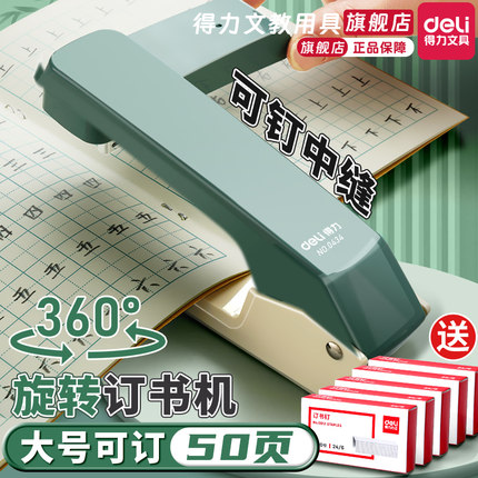 【旋转款可定50张】得力旗舰店订书机学生用订书器办公用大号重型加厚钉书机型多功能省力迷你小号钉定厚书订