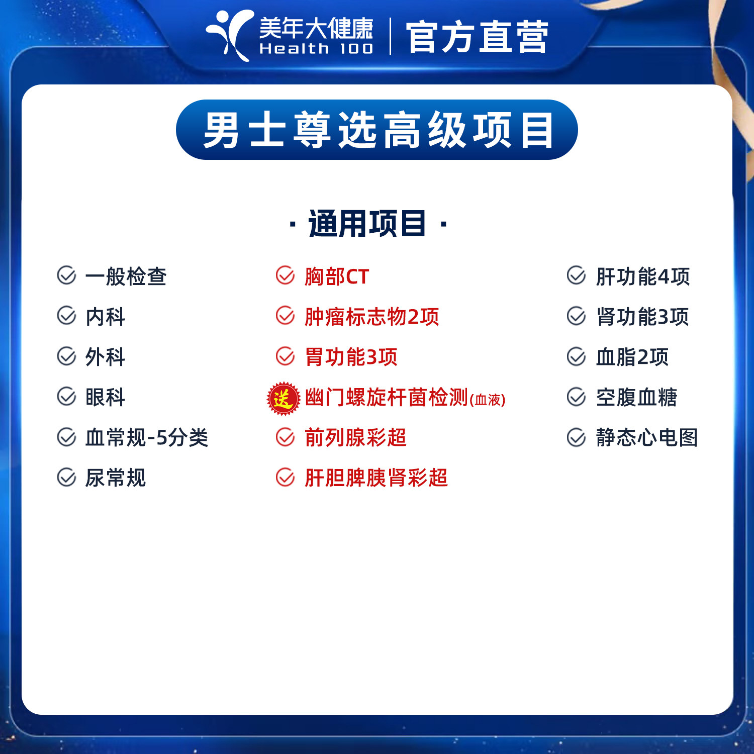 美年大健康男士尊选高级体检套餐 胸部ct中青老年男性通用体检