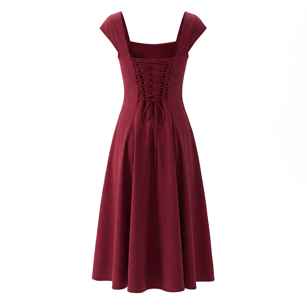 大方优雅酒红色方领中长款绑带连衣裙年会收腰气质礼服裙过膝长裙