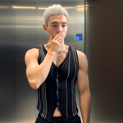 男士春夏新款V领针织马甲复古修身开衫气质无袖背心上衣条纹时尚