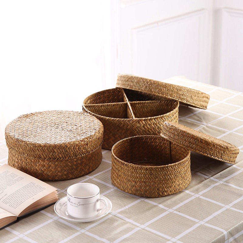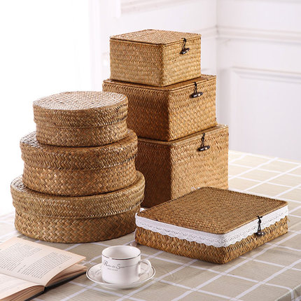 海草编织篮草编篮带盖桌面客厅收纳筐藤编收纳盒厨房储物收纳篮子