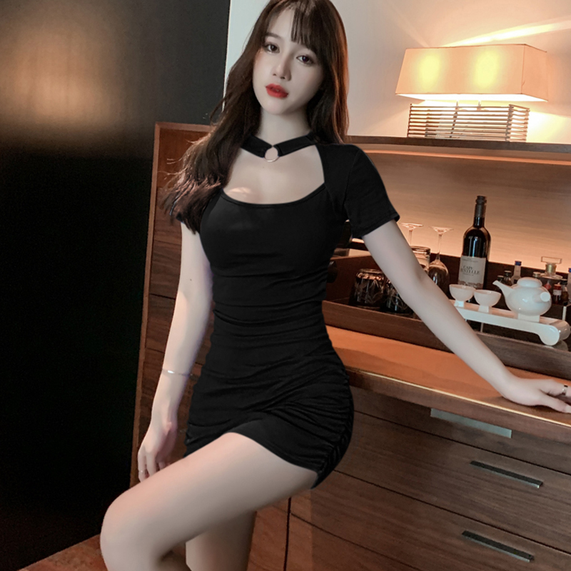 夏季小个子方领挂脖短袖连衣裙女别致性感包臀裙辣妹收腰显瘦短裙