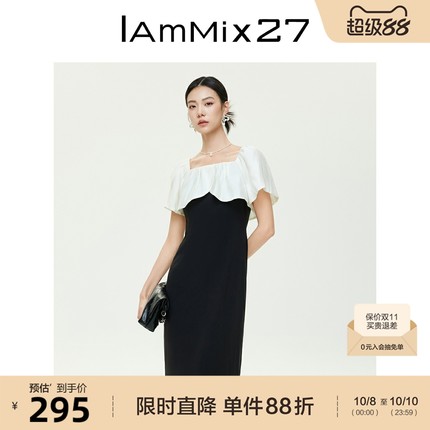 IAmMIX27法式方领连衣裙女撞色荷叶边拼接收腰修身后开衩A字裙女