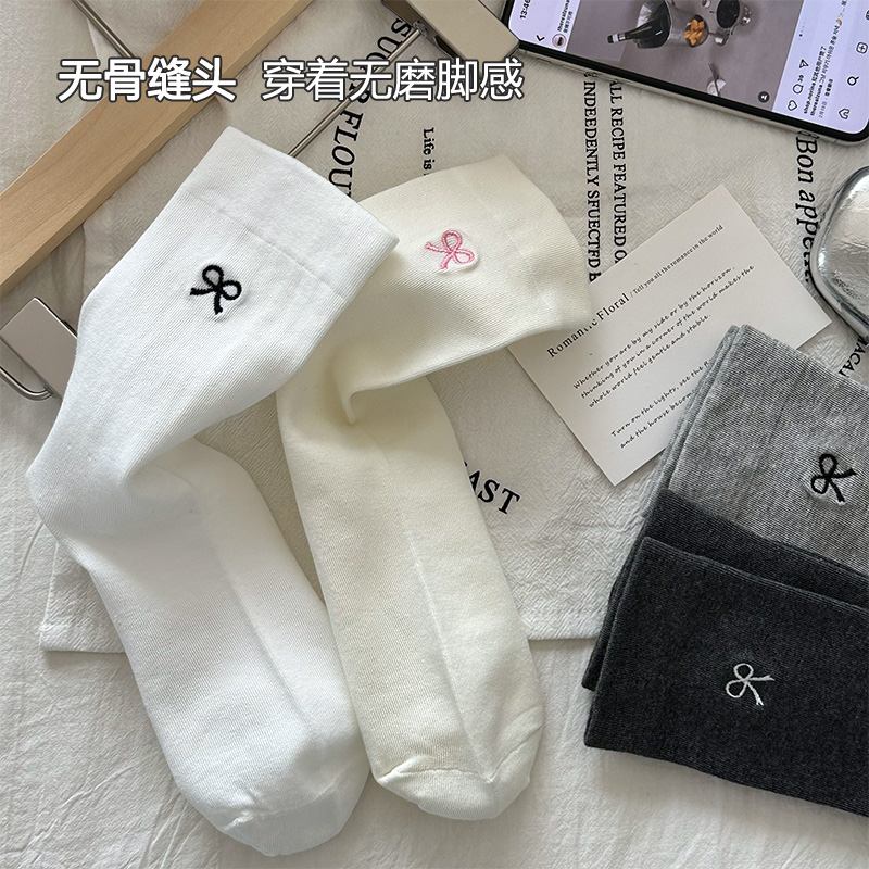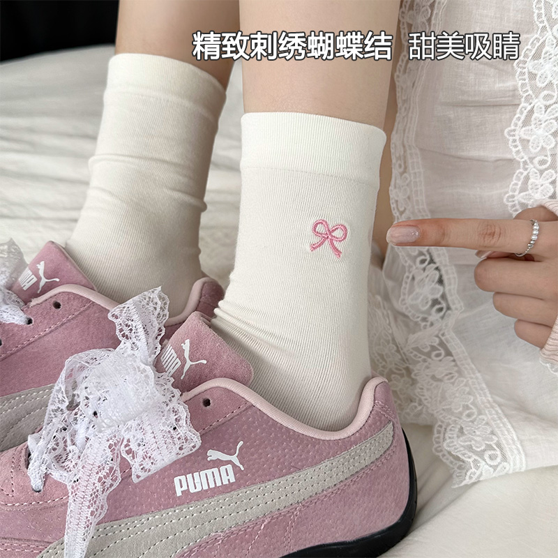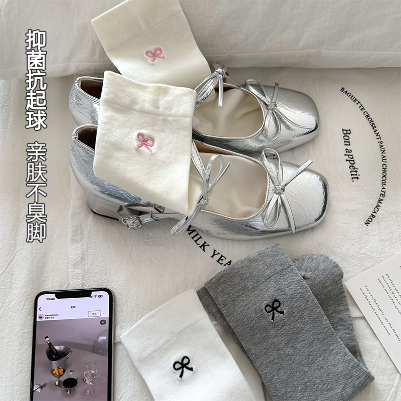 白色蝴蝶结袜子女款春夏季ins潮中筒袜无骨防臭抗菌棉袜夏天长袜