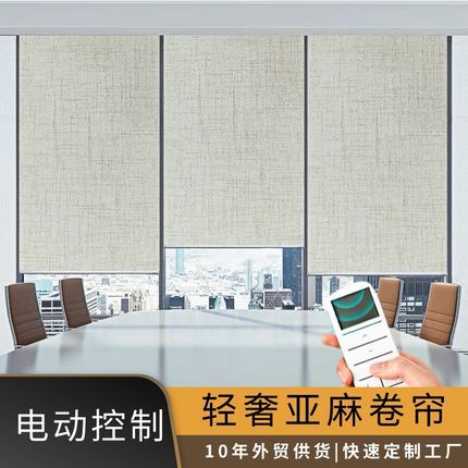 办公室手拉电动升降全遮光亚麻卷帘书房阳台展厅中式古风卷帘窗帘
