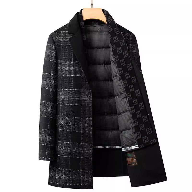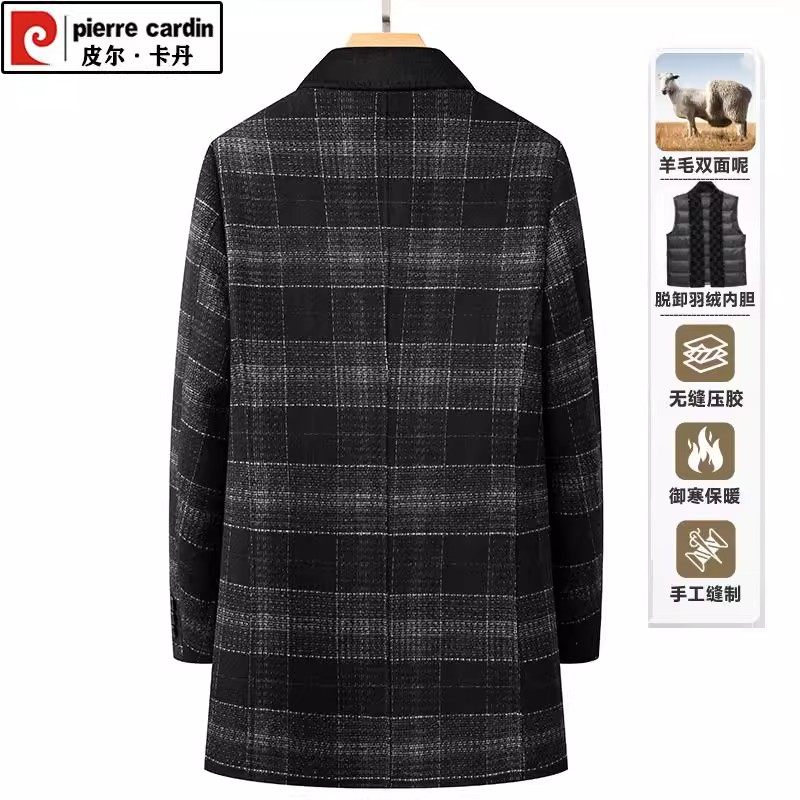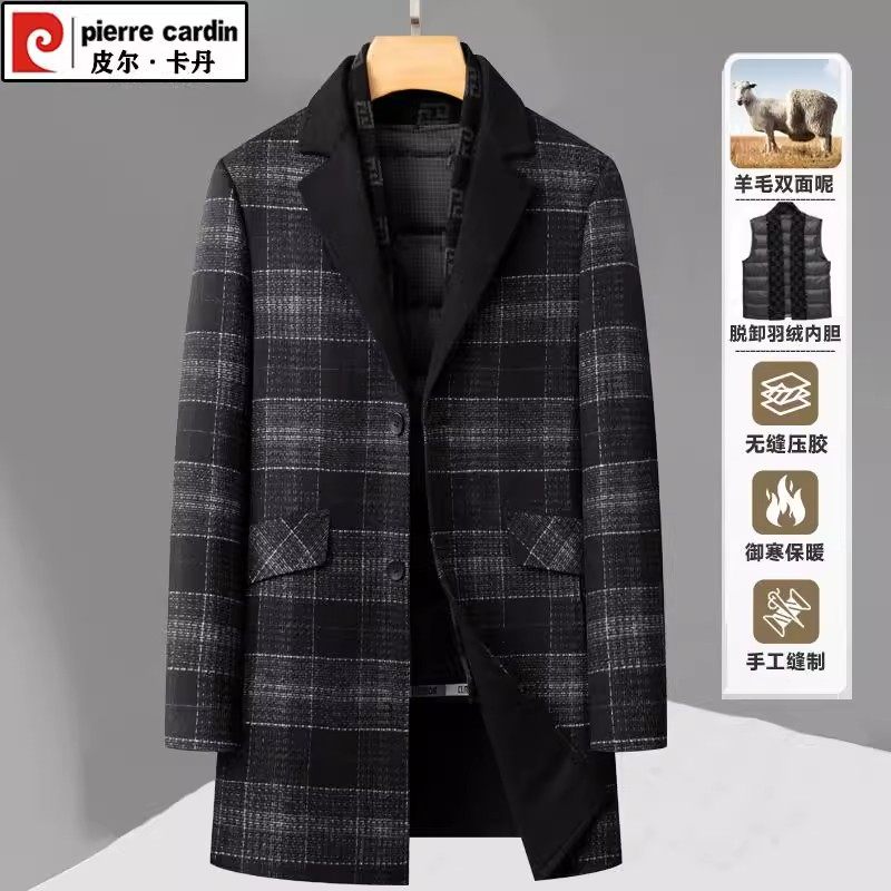 皮尔卡丹冬季男士双面羊毛呢大衣中长款外套围巾领加厚青中年羽绒