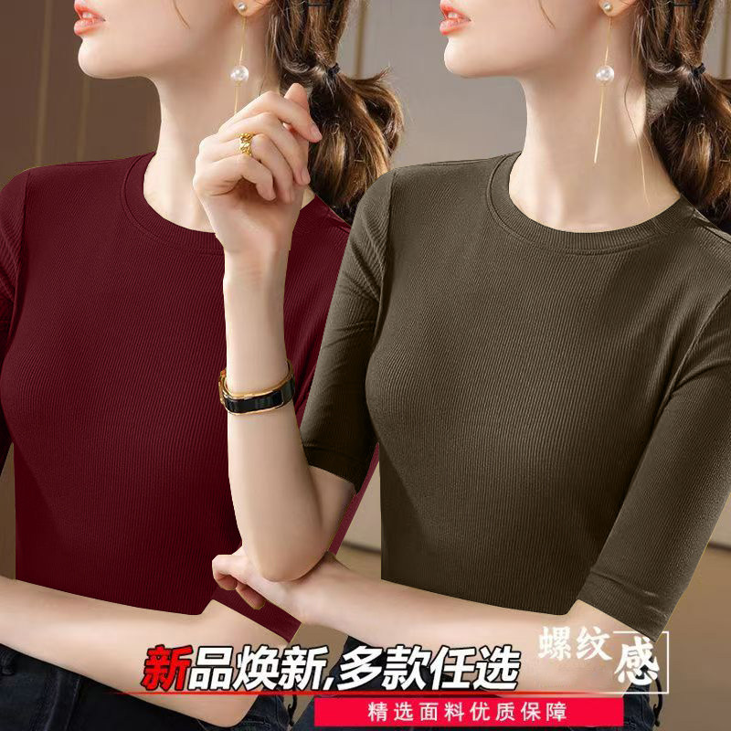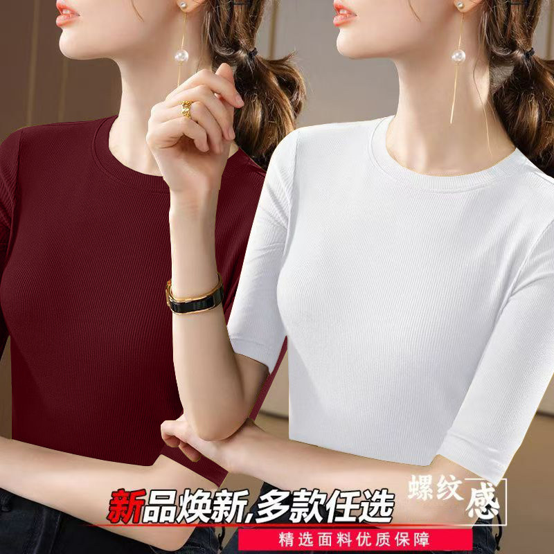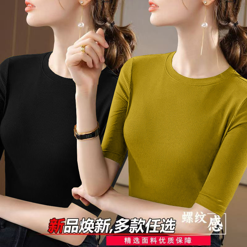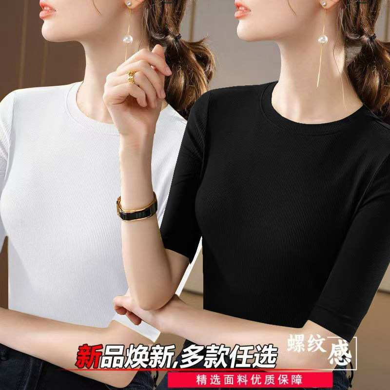 单/两件夏季新款五分中袖螺纹正肩圆领上衣修身显瘦女T恤短袖衫