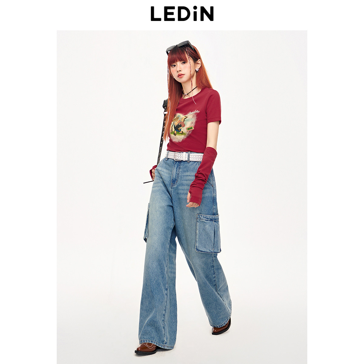 乐町2024夏季新款松紧腰工装牛仔阔腿裤C2HAE2158
