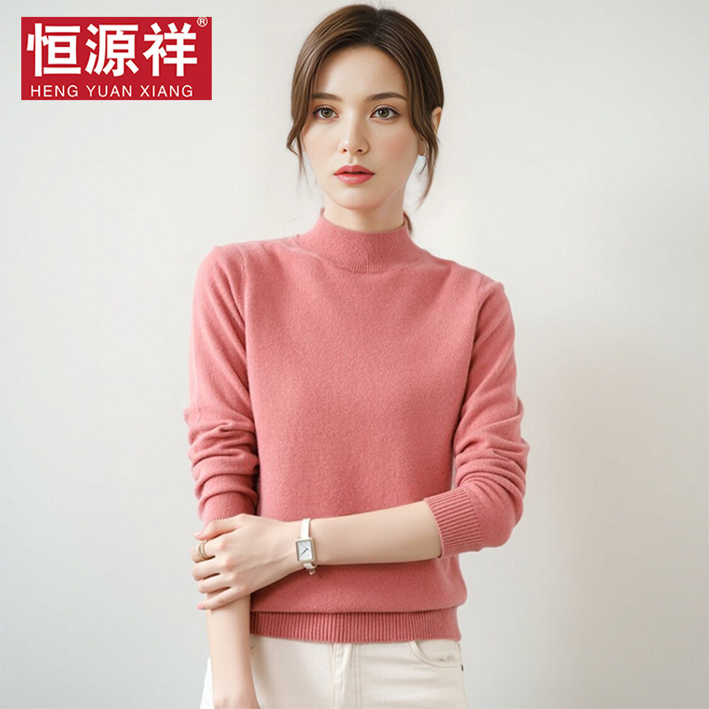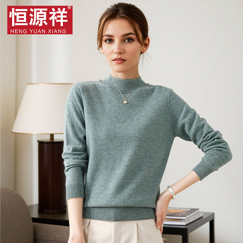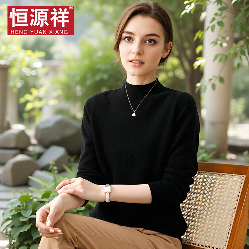 恒源祥半高领针织衫女纯羊毛衫秋冬新款纯黑色套头无羊绒打底毛衣