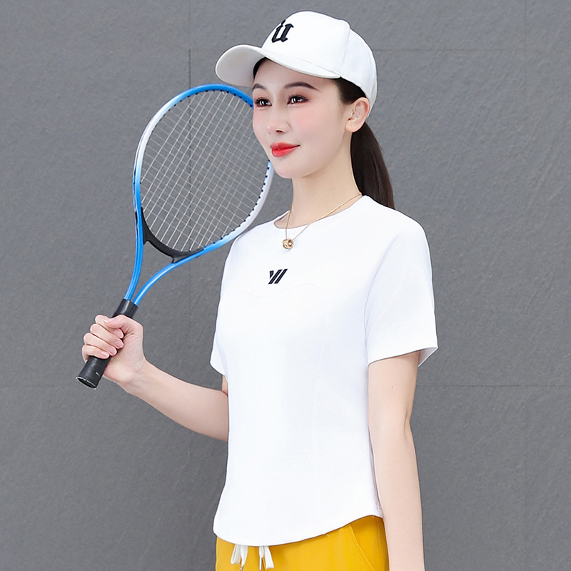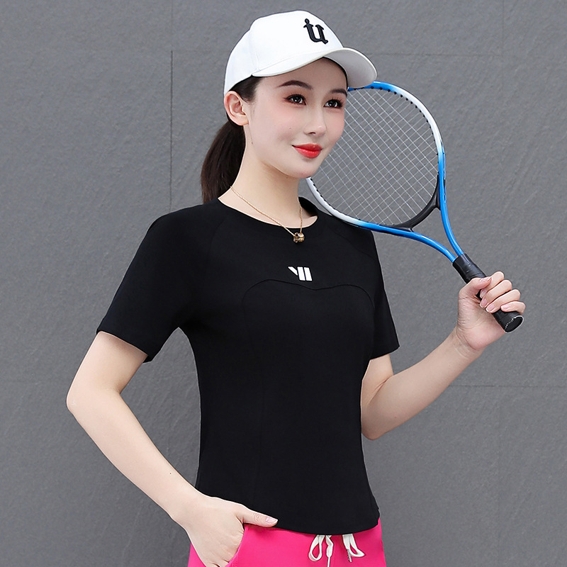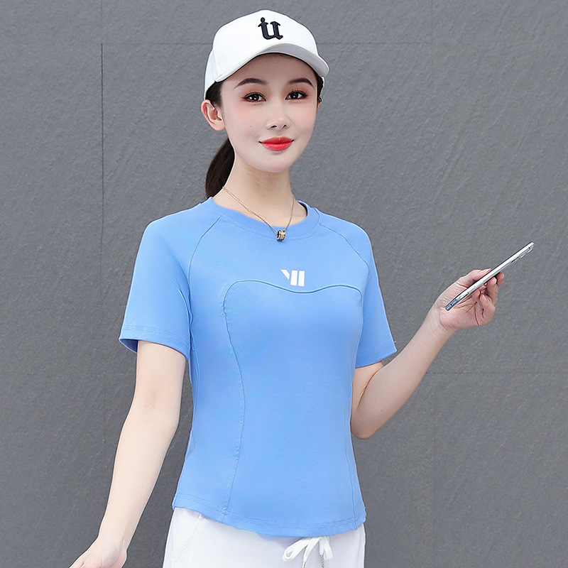 广场舞服装新款刺绣运动休闲圆领棉T恤健身跳操显瘦修身短袖上衣