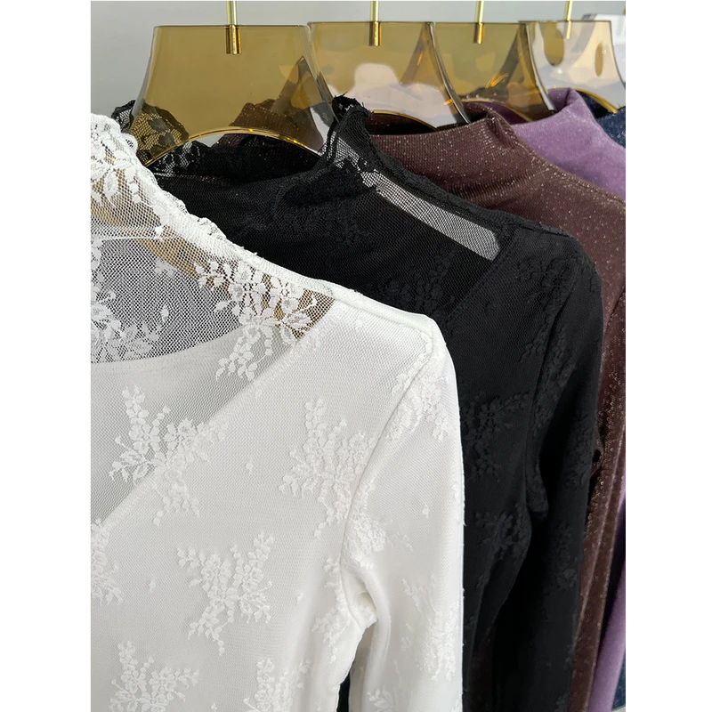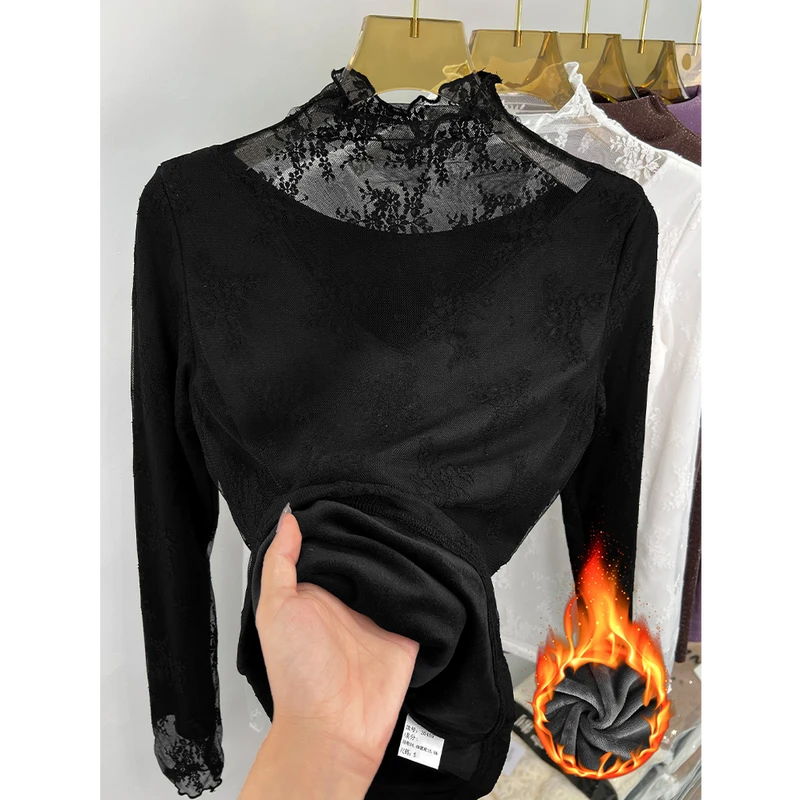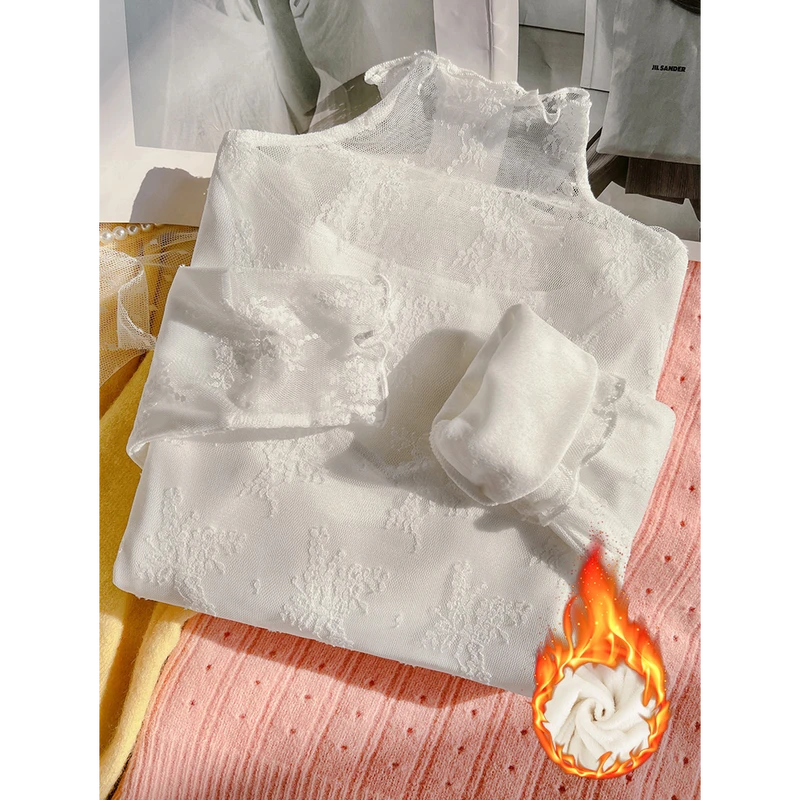 半高领加绒蕾丝打底衫女2025新款春秋高级感时尚洋气内搭网纱上衣