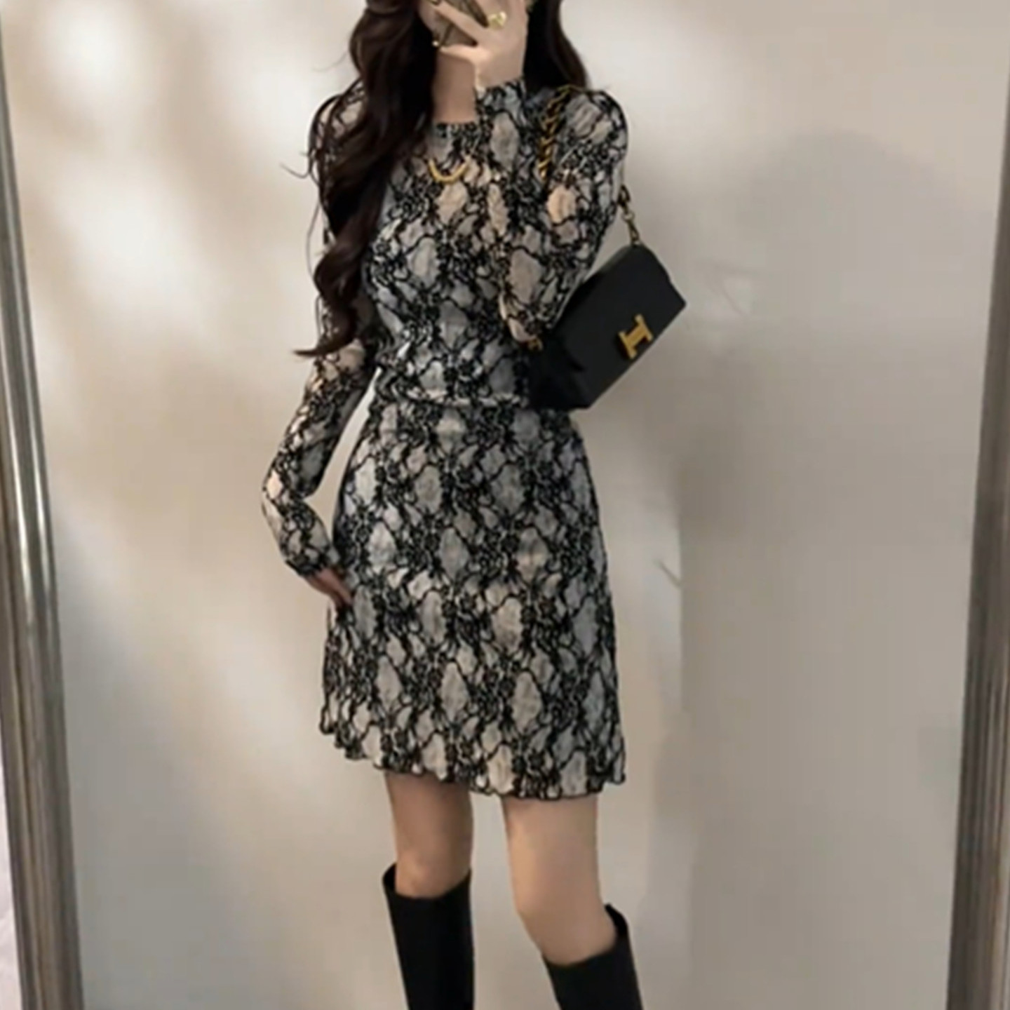 法式气质蕾丝加厚长袖连衣裙女秋冬巨好看显瘦绝美包臀打底短裙潮