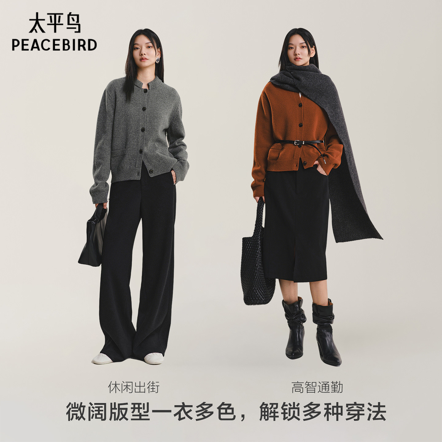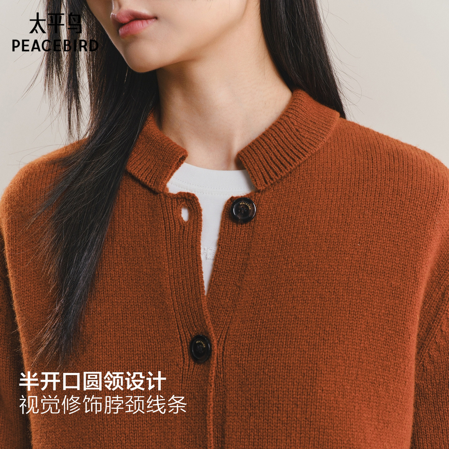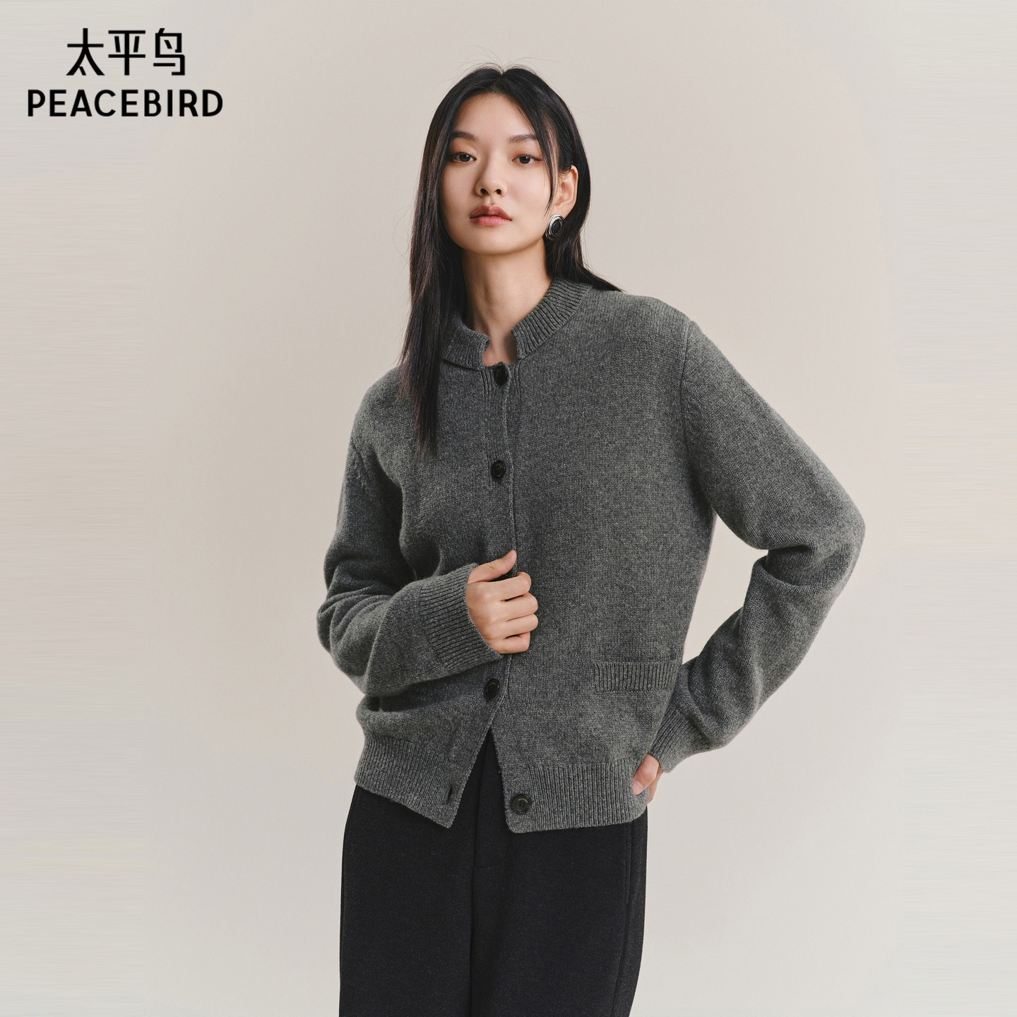 太平鸟高品质全羊毛针织开衫25冬季新款个性罗纹圆领宽松毛衫外套