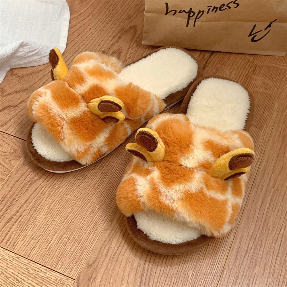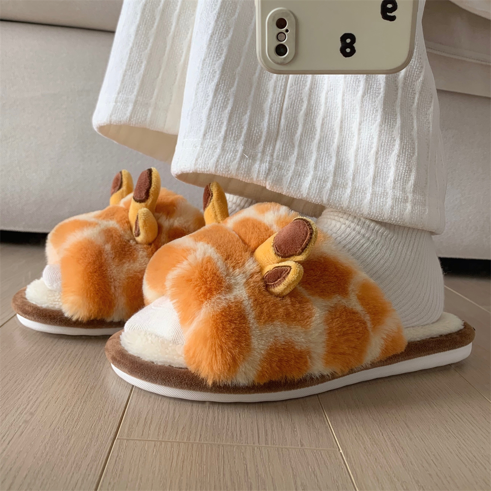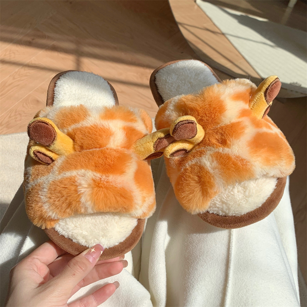 细细条 女士秋冬季ins学生新款卡通长颈鹿毛绒绒棉拖鞋防滑月子鞋