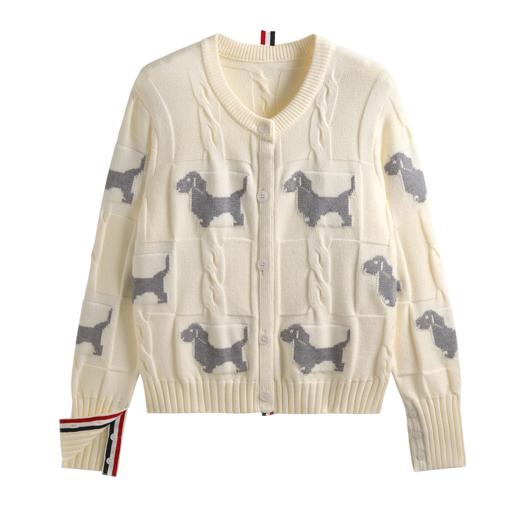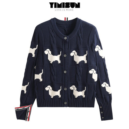 YIMISUN百搭设计感狗狗提花麻花慵懒圆领针织开衫女上衣短款外套