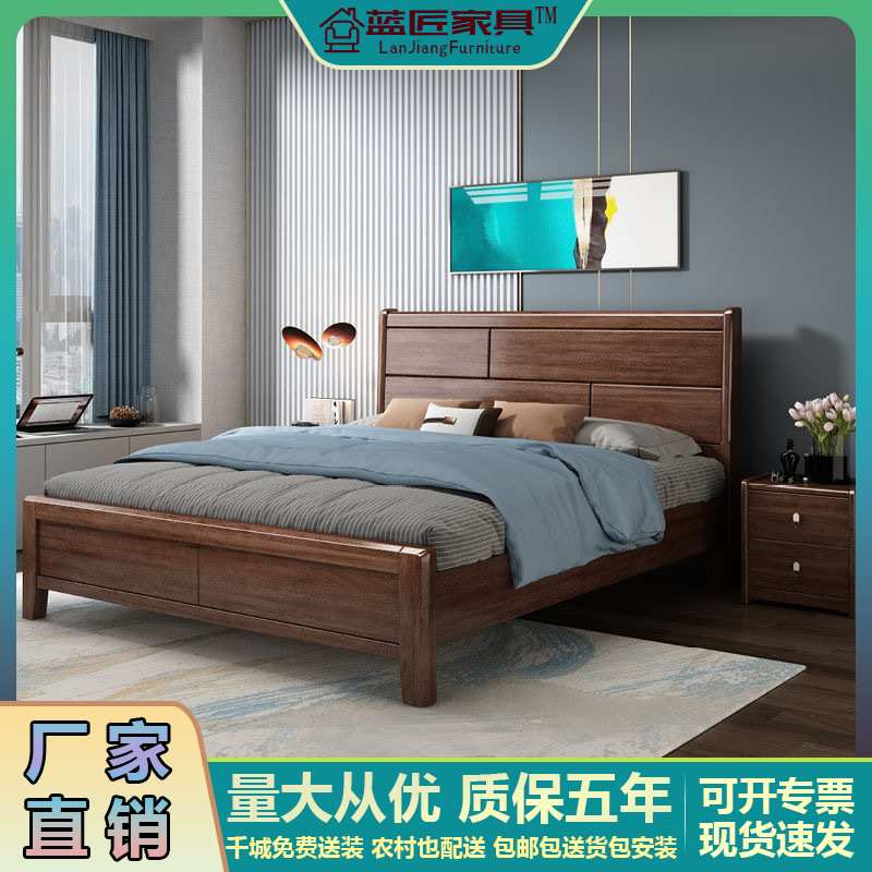 新中式胡桃木实木床1.8M卧室双人大床现代简约1.5M单人气压储物床