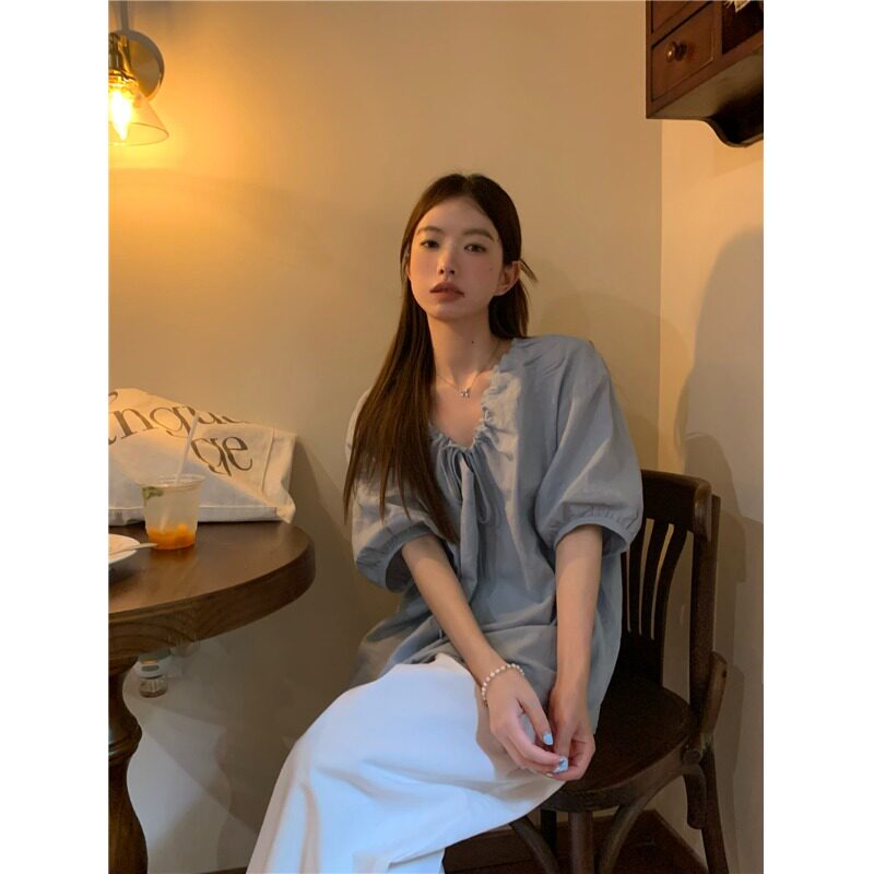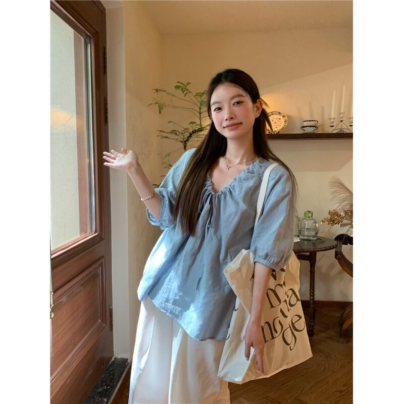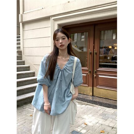 法式高级感V领蓝色短袖衬衫女春夏2026新款宽松慵懒韩系气质上衣
