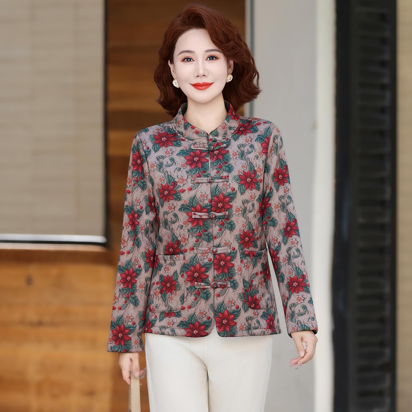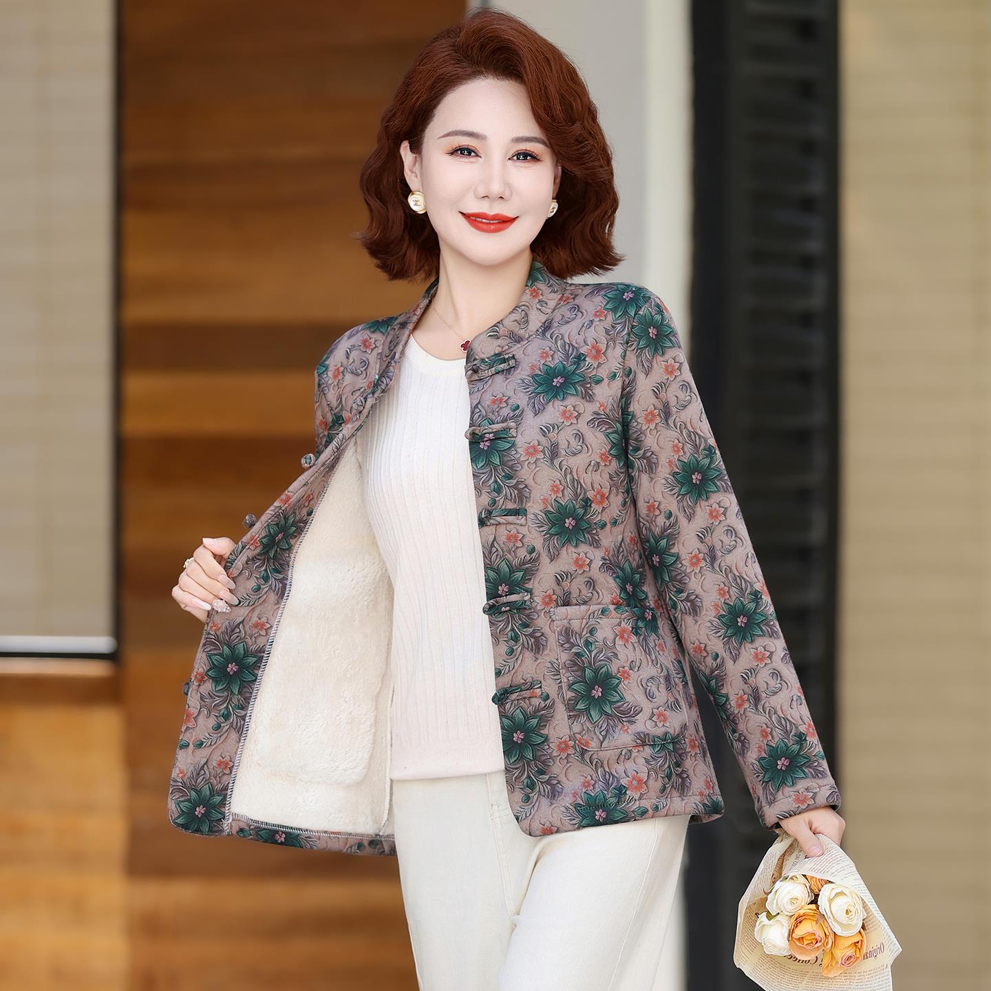 妈妈装加绒中式外套秋冬2025新款盘扣开衫中老年女装洋气花色上衣