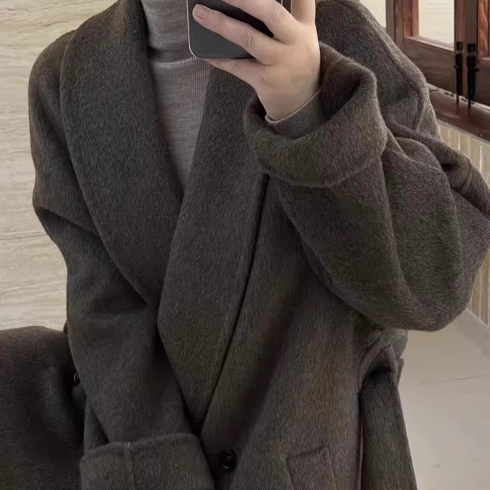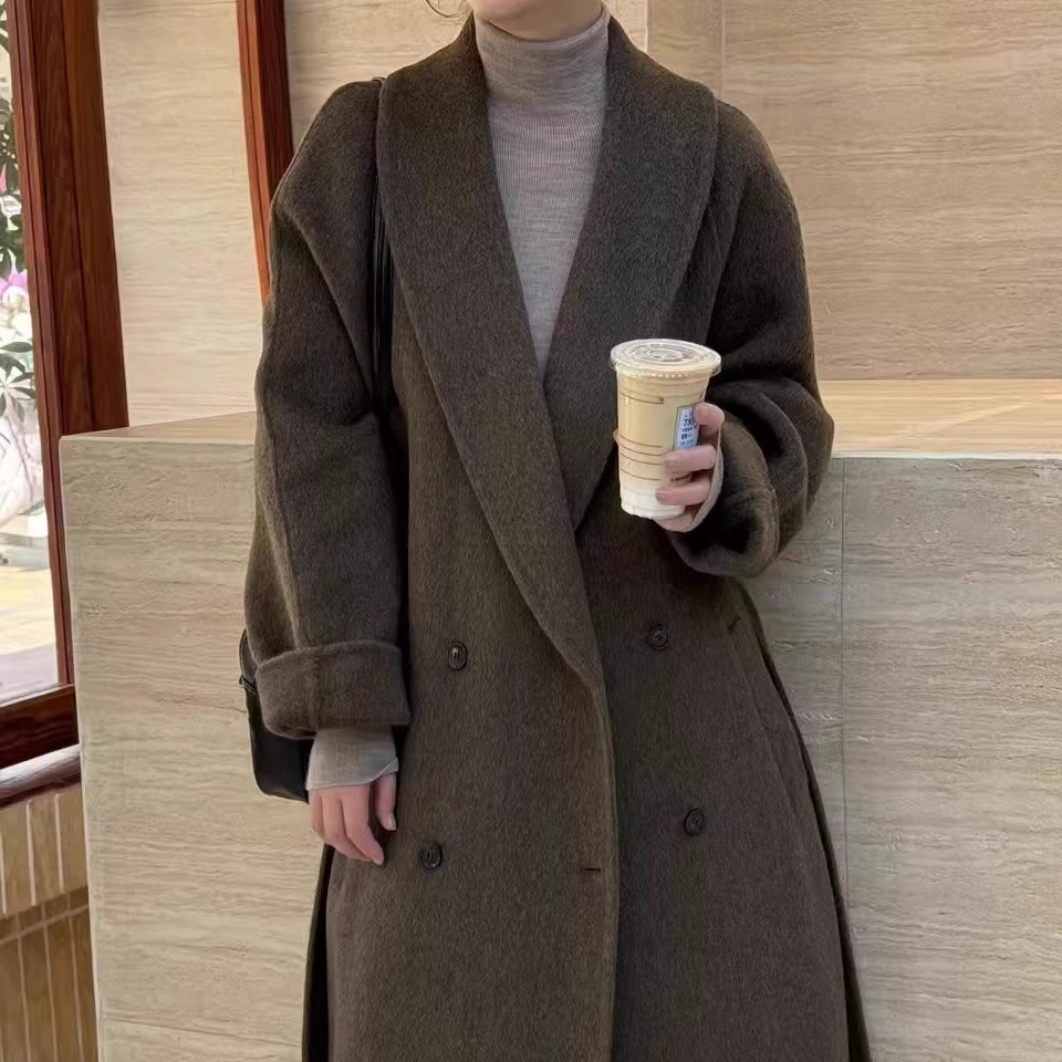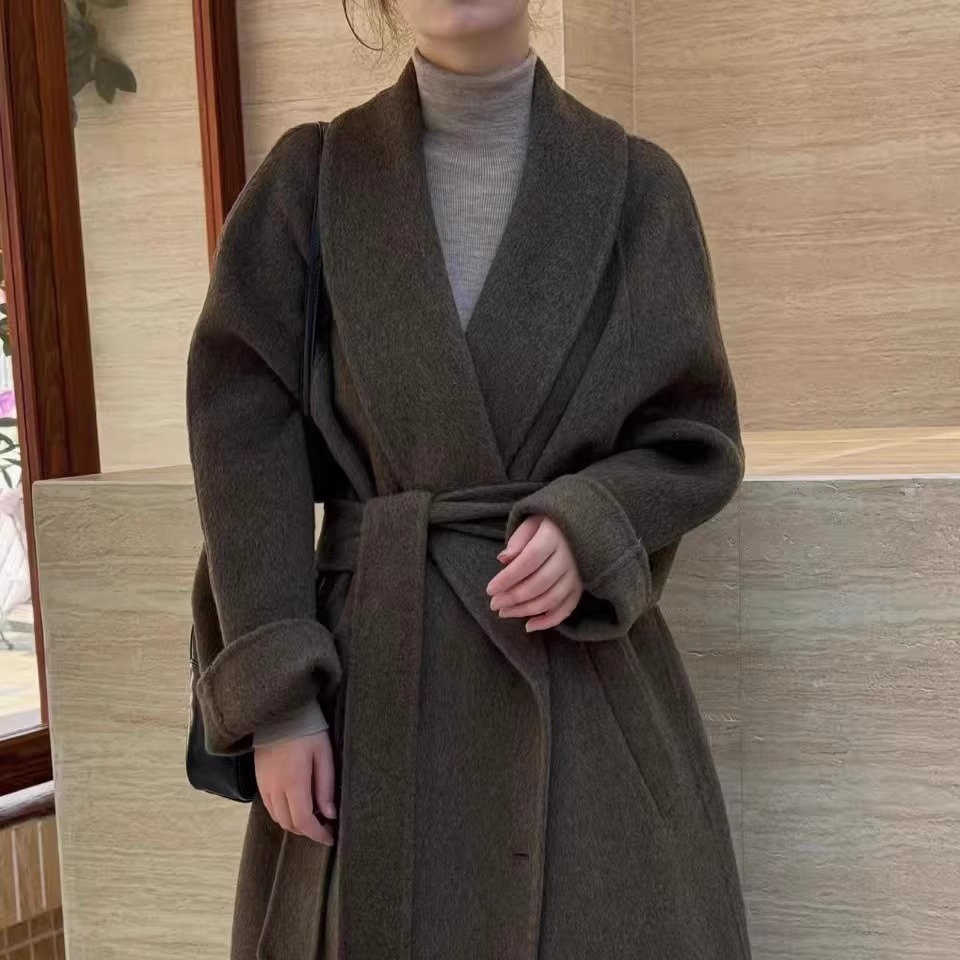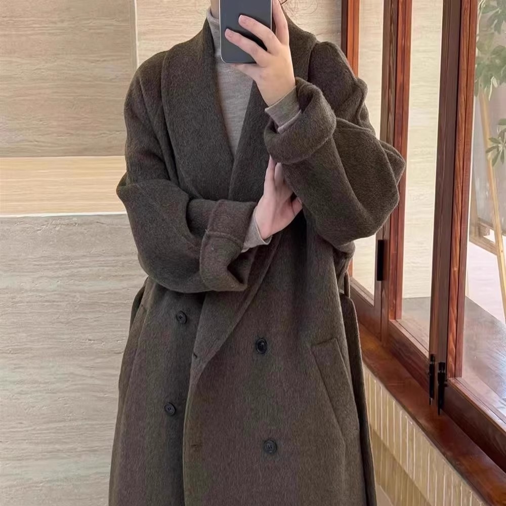 气质高级感双面羊毛羊绒加长青果领宽松系带气质加厚大衣外套女