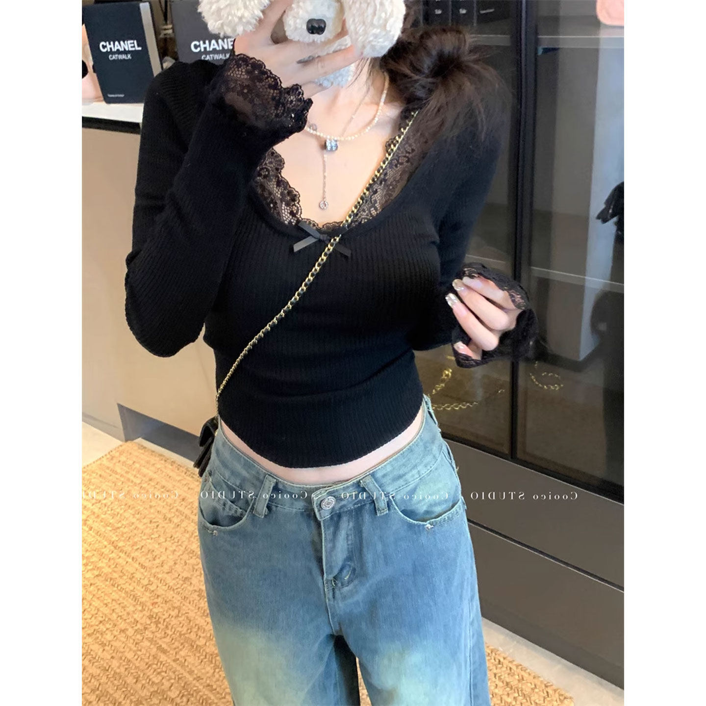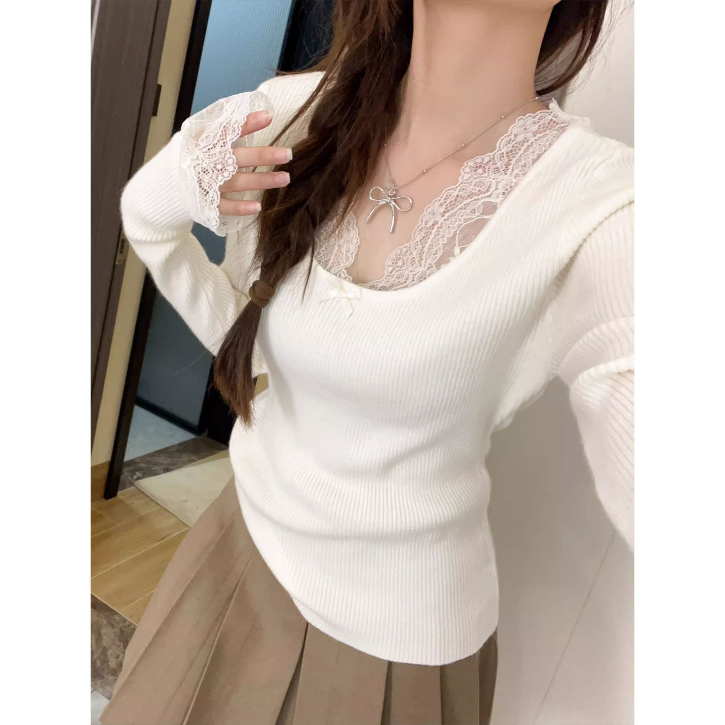 白色蕾丝毛衣内搭叠穿女秋冬大码胖MM复古花边长袖套头打底针织衫