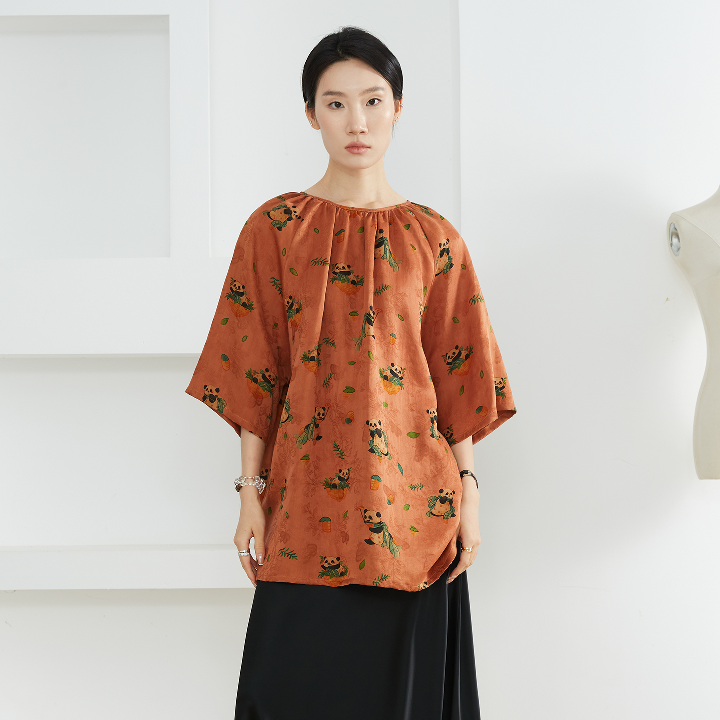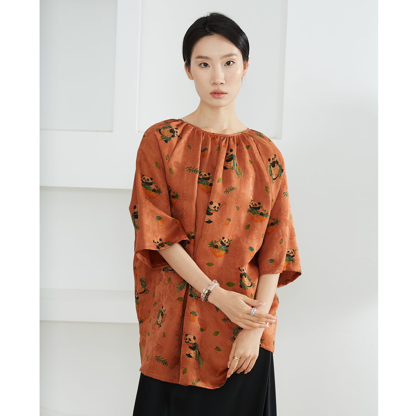 一丝牵100%桑蚕丝橙熊猫绞罗红云纱花萝真丝宽松国风提花袍子上衣